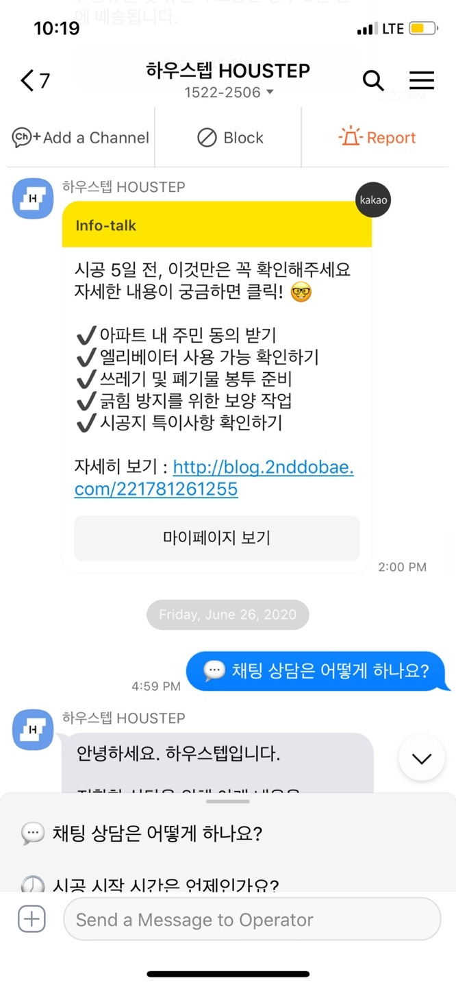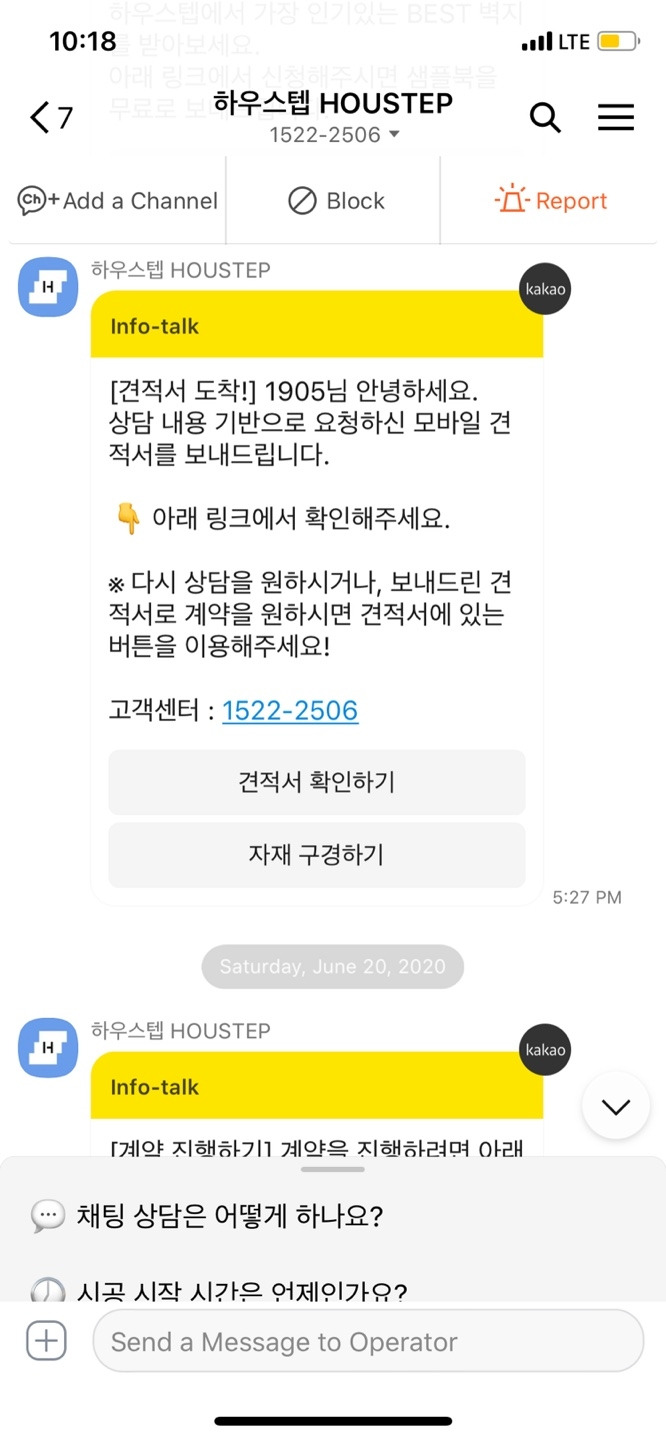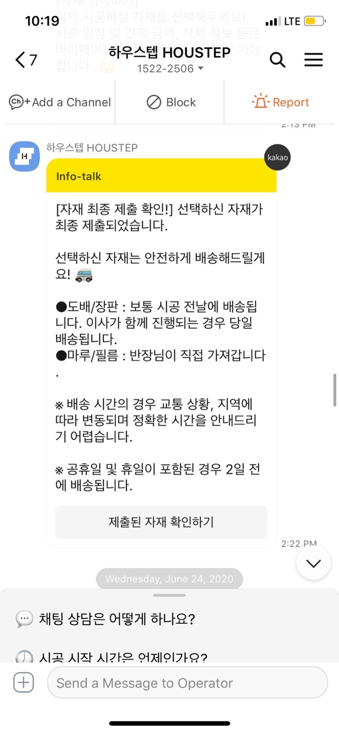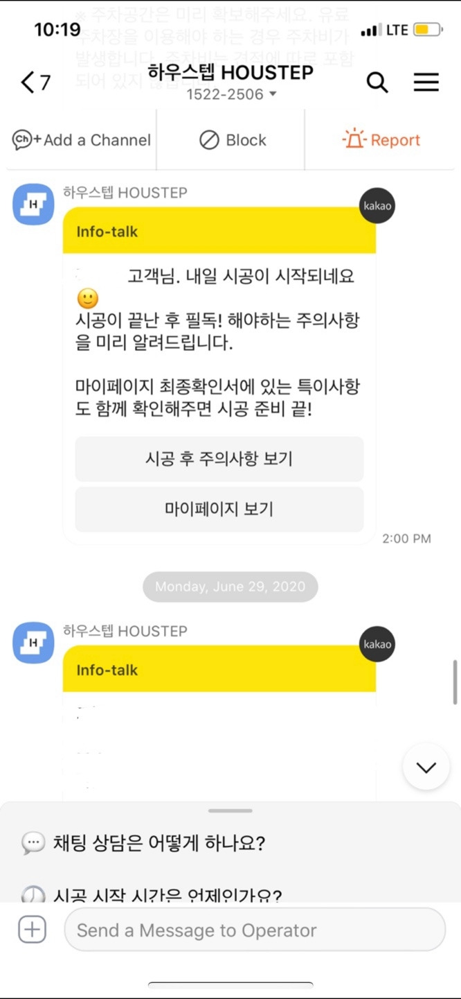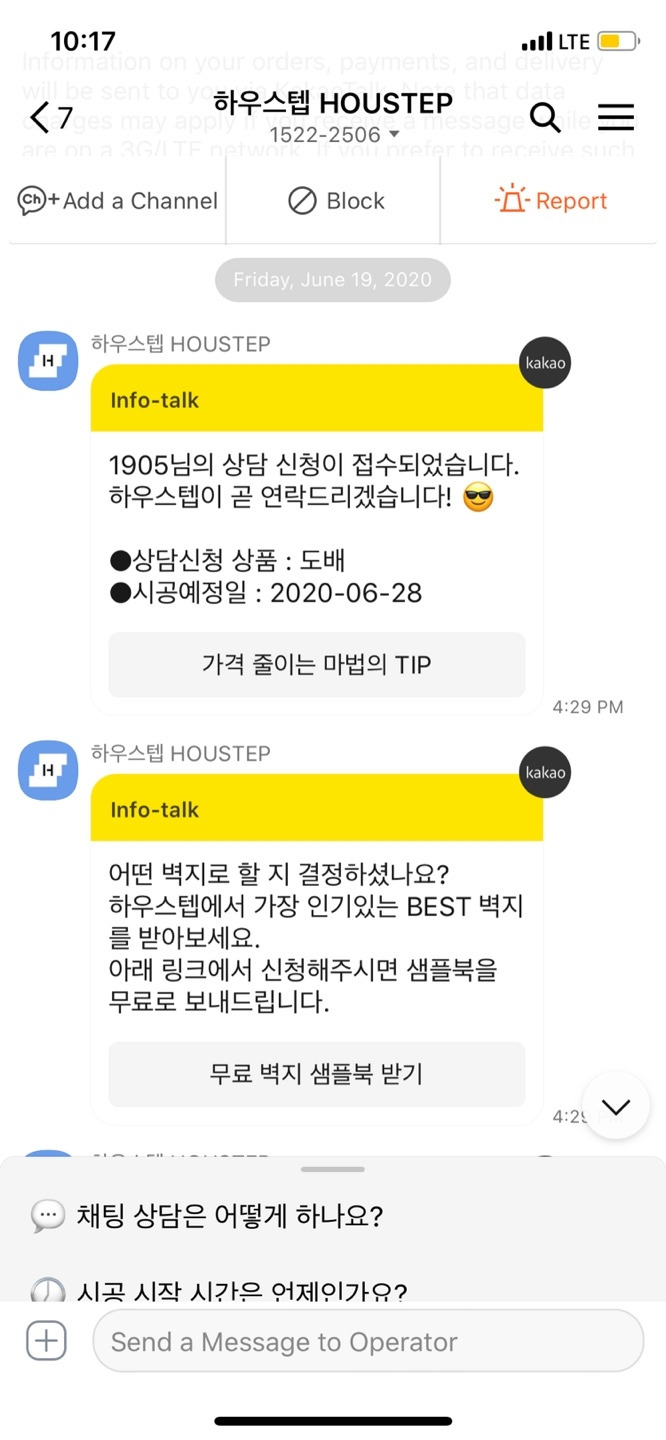 공감을 끌어내기 위한 구구절절한 서두가 길었다. 하우스텝은 온라인 인테리어 시공 서비스를 제공하는 스타트업이다. 그리고 페인트며 금속이며 필요한 재료는 직접 사다가 뚝딱거릴 줄 알아도 시공 견적 하나 뽑는 것도 빨리 못하고 고생하는 내게 찾아온 희망이었다. 도배, 장판, 마루, 필름, 데코타일, 창호, 문, 문틀, 몰딩 등등 베스킨라빈스에서 아이스크림 고르 듯 원하는 시공만 골라서 견적을 낼 수 있다. 앱은 아직 없지만 카카오톡 비즈니스 채널과 반응형 웹으로 서비스를 제공하고 있으며, 오프라인 쇼룸도 운영하고 있었다. 온라인으로 상담하다가 여차하면 오프라인으로 달려갈 수 있는 내게 너무 필요한 조건이었다. 미리 준비한 건축물대장을 보면서 빠르게 견적 산정을 위한 정보를 입력하고 상담 전화가 오길 기다렸다. 전화상담을 제외하곤 견적부터 계약, 시공 안내까지 대부분의 커뮤니케이션은 카카오톡 채널의 비즈니스 기능으로 진행된다.