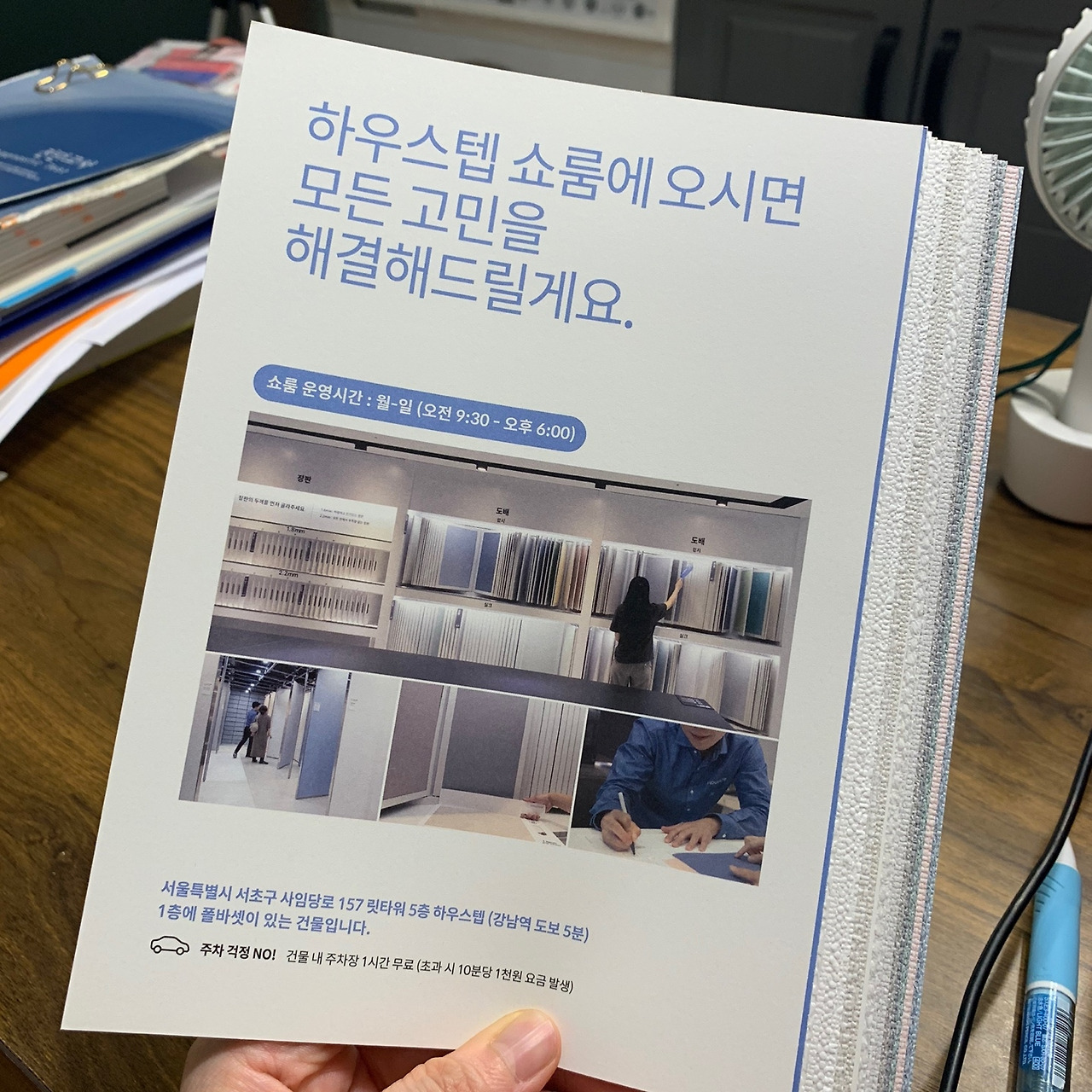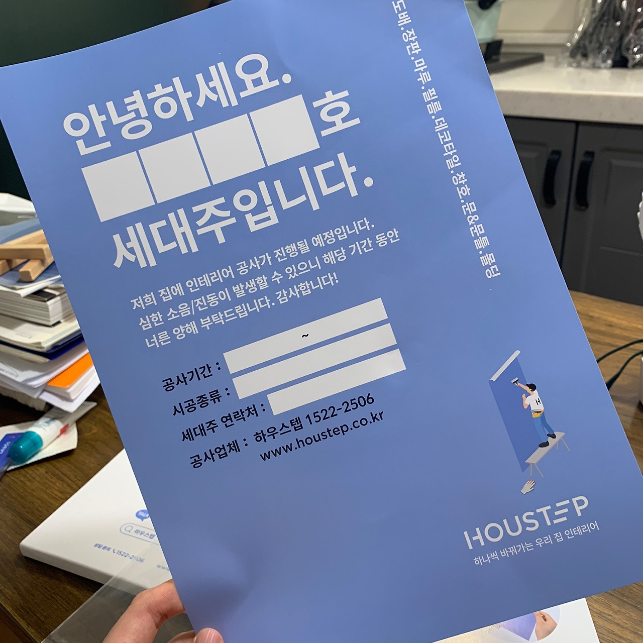 벽지를 고르는 일은 금방 끝났다. 기존 벽지와 비슷한 것을 찾으려 했기에 가져간 걸 대어보고 바로 골랐다. 그리고 직원분께서 안내해주시는 순서대로 자재 결정을 마쳤다. 쇼룸 도착해서 여기까지 한 10여분 걸렸나. 그 이후에는 벽지 외에 샷시나 마루, 장판 등 평소에는 내가 쉽게 만져볼 수 없는 자재들을 실컷 구경했다. 신나게 눈에 담아야 다음에 필요할 때 또 당황하지 않을 테니 재밌게 눈으로 공부했다. 떠날 때 직원분께서 내가 고른 벽지 샘플과 함께 꼭 이번 시공이 아니더라도 필요할 때 쓰시라며 안내문을 챙겨주셨다. 시공 날 같은 건물에서 지내는 이웃에게 시공 소식을 전하고 양해를 구하는 안내문이다. 고객 경험의 디테일을 사랑하는 유나킴은 이 안내문을 안 버리고 지금도 가지고 있다. 사소할지라도 세심한 배려는 결국 고객에게 재구매(repurchase)와 지지(advocacy)를 이끌어내니까. 이는 내가 스타트업에서 제너럴리스트로 일하면서 몸소 깨달은 공부이기도 하지.