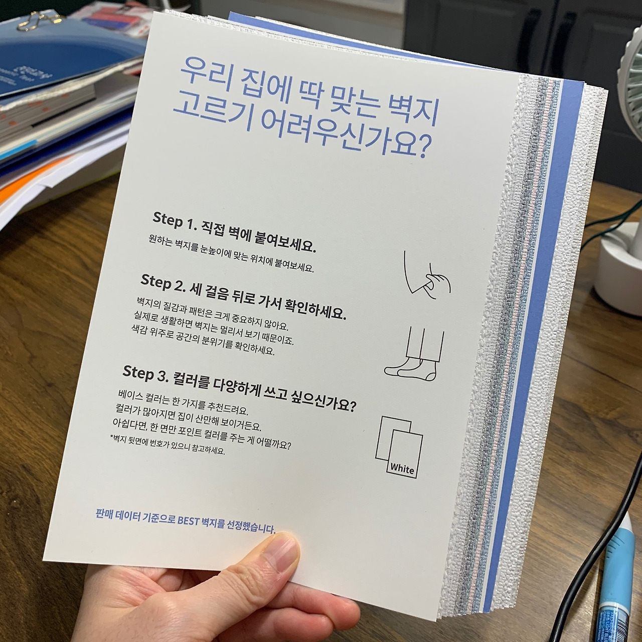 아, 내가 사랑한 고객 경험의 디테일이 하나 더 있다. 신청했던 벽지 샘플이 도착했다. 이미 결정하고 난 후라 아무 생각 없이 뜯었다. 뭐가 됐건 택배 뜯는 건 신나니까. 사실 아주 특별한 색과 패턴의 벽지를 고르지 않는 이상, 어떤 가구나 몰딩에도 어울리는 무채색 베스트 20 안에서 결정이 나기 마련이다. 그렇지만 문제는 그 베스트 20이 꽤나 다들 비슷하다는 거다. 돋보기로 보는 거 아니고는 큰 차이가 없을 것 같은 화이트 계열 벽지를 한 댓 장 넘기면서 생각했다. '쇼룸에 다녀오길 잘했나, 다 비슷한 것 같아서 뭘 골라야 할지 모르겠는데.' 그리곤 적절한 타이밍에 난 그들에게 내 생각을 간파당했다. 샘플을 넘기다 발견한 간지(間紙)가 날 이렇게 감동시킬 줄이야. 한 다섯 장 넘기고 든 생각에 영화적 장치도 아니고 뿅 하고 나타난 이 간지는 누가 넣자고 했을까. 샘플 벽지를 함께 보자는 스타트 신호 > 어쩔 수 없고 당연하게도 비슷한 샘플 벽지의 연속 > 적절한 타이밍에 나타난 고객의 고민해결을 돕기 위한 tip이 적힌 간지 > 나머지 샘플 벽지를 유심히 볼 수 있는 힘을 주고 > 그래도 모르겠다면 걱정하지 말고 쇼룸에 오시라는 든든한 안내까지.