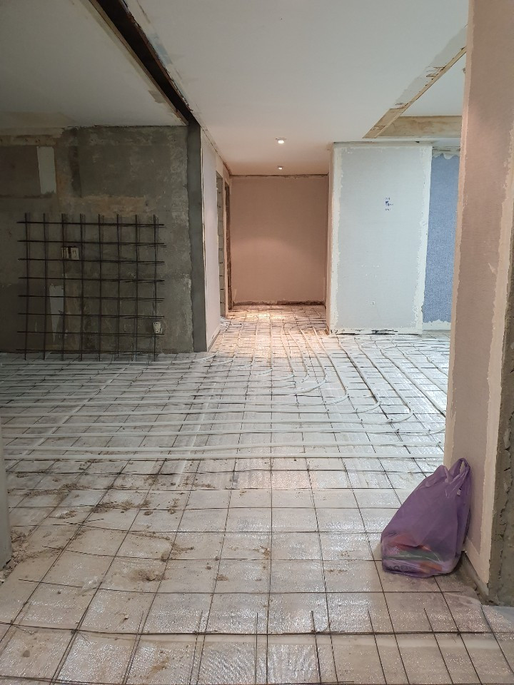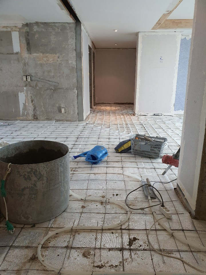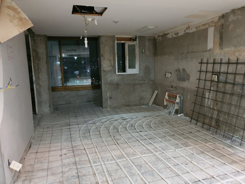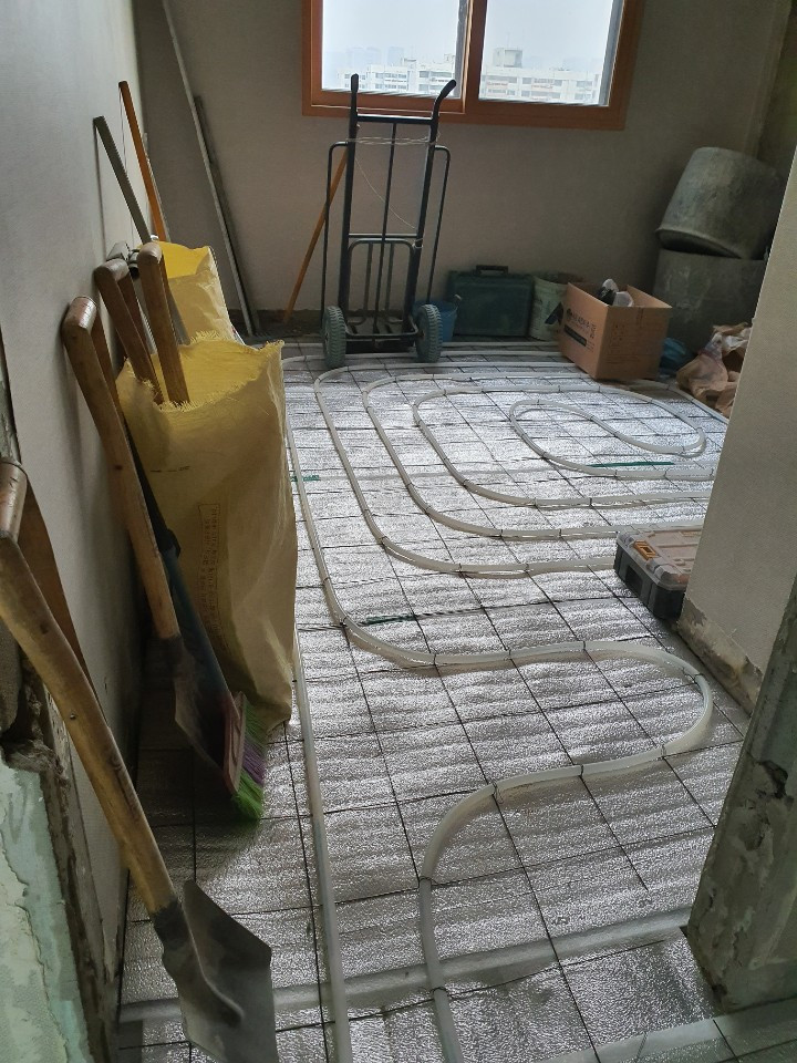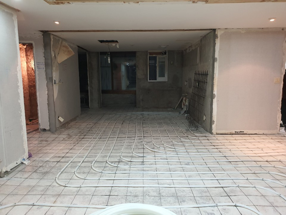 전체철거가 완료가 되고 폐기물처리까지 되었다면 배관난방을 새로 싹 까는 작업을 한다. 이날은 소음날것이 없어 조용히 진행된다. 새로 난방관이 깔리면 사진을 공간별로 찍어놓는 것이 좋다. 난방관이 어디로 지나가는지 나중에 덮고나서 파악하기가 좋다.