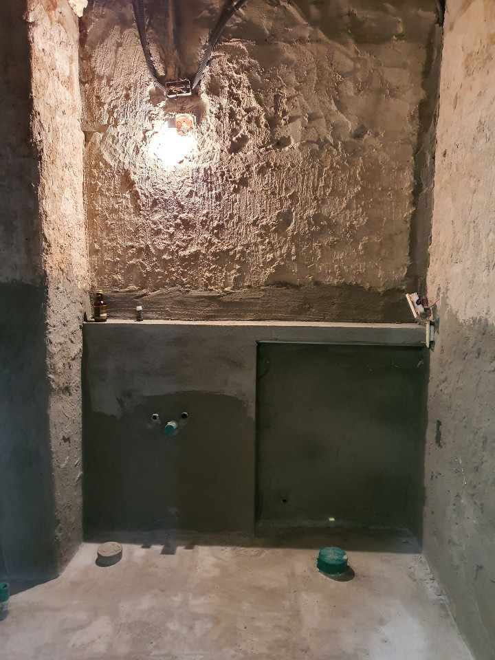 화장실의 새로운 배관 및 새로운 젠다이가 조적된 모습젠다이를 원하면 설비공사시 조적을 쌓아야한다. 원하는 높이를 미리 말해두어야한다. 세면대 변기 공간이 반반, 세면대에도 세면대배관이 정중앙, 이것만 봐도 완성시 대칭이 예쁠 것 같다.