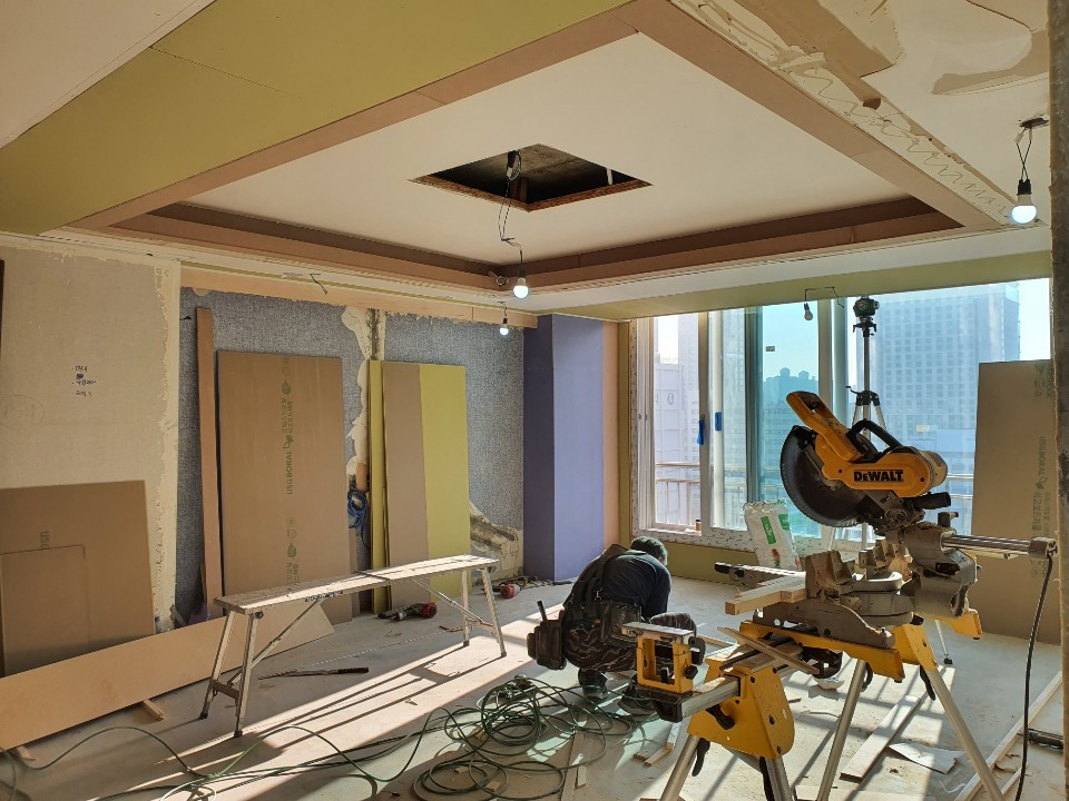 목공작업으로 필요한 것은 단열 및 창호보강, 문 및 문틀교체, 천장, 주방후드자바라 연장, 가벽세우기 등이 있었다. 이정도 작업량에 총 3일정도 소요된다. 목공작업이 있는 날은 자재도 많고 공구 또한 엄청나게 많다. 소음과 먼지가 무지난다. 이웃집들에게 목공공사가 있는날은 알려드리는 것 또한 예의일 수 있다. 작업자분들이 왔다갔다하면서 나무분진 같은 것들을 우리집 문 밖, 엘리베이터에 많이 흘리신다. 이웃들에게 피해를 덜 끼치게 하려면 그날은 주의해서 청소를 해야한다.