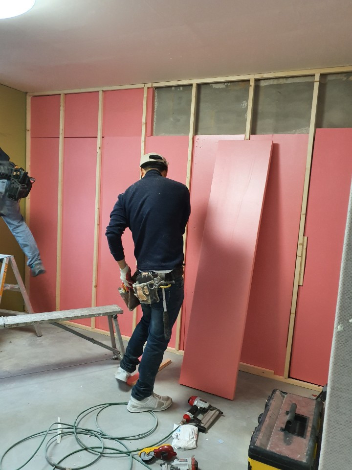 단열제와 석고보드로 창호보강 및 외벽 단열 중인 모습