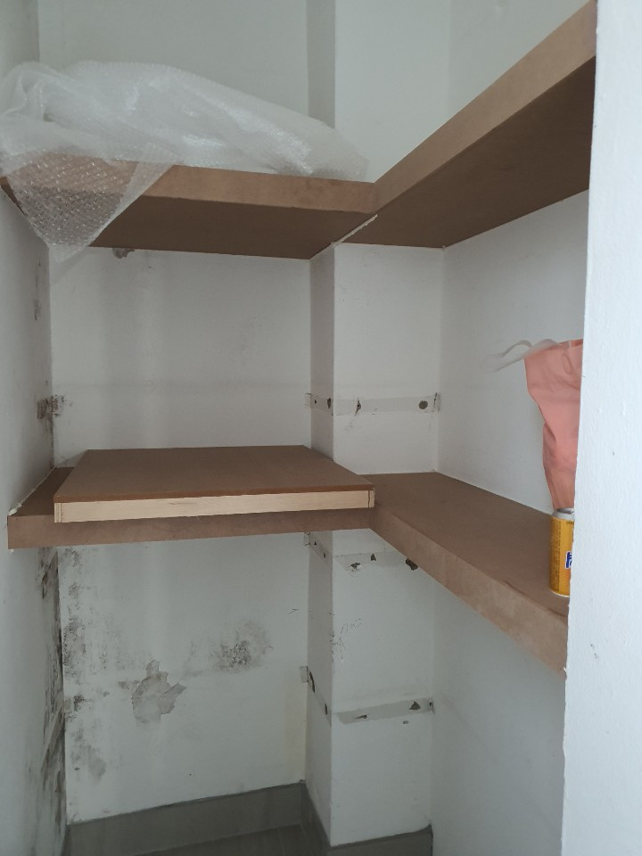 기존에 베란다 선반이 너무 낡고 약해서 뭘 올리기도 불안한 상황이라, 다 철거를 해내고 목공단계에서 새롭게 선반을 제작하였다. 이렇게 제작을 해놓고 페인트칠을 해서 완성하였다.