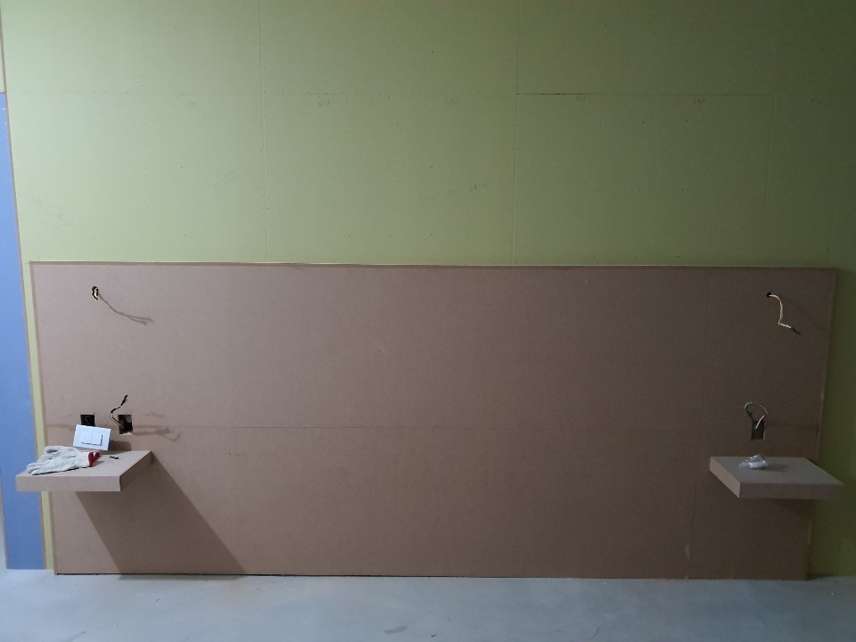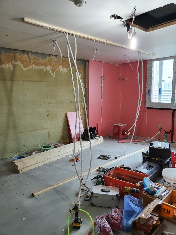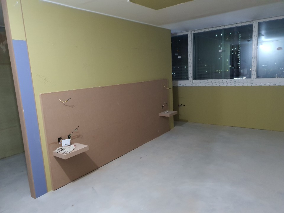 가벽을 세우고 필자처럼 침대프레임을 붙여짜든 벽부등을 설치하든 할 예정이라면, 가벽을 세우는 목공단계에서 전기 작업자분께 이러한 내용을 말씀드려야만한다. 가벽을 세울 때에 전기 작업자분께서 가벽 안쪽으로 전기선을 끌어내려놓으시고 프레임 밖으로 다시 전기선을 빼내셔야 나중에 조명과 스위치를 달 수 있기 때문이다.