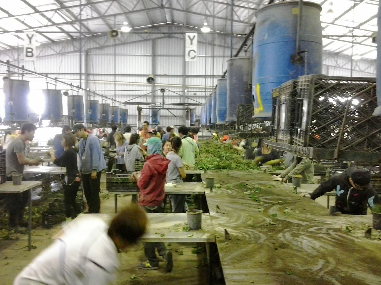 농장주는 매일 새벽이면 트럭을 몰고 가 딸기 모종의 뿌리조차 다치지 않게 밭의 흙을 통째로 퍼왔다. 그러고는 업무가 시작하면 작업자들 테이블 위로 돌아다니는 드럼통에 나누어 담아주었다. 우리들은 배정받은 위치에서 서서 자기 머리 위로 돌아다니는 드럼통이 본인 테이블 위에 오면, 그 순간 통 아랫부분 손잡이를 잡아 쳐야 했다. 그러면 아래쪽 뚜껑이 열리면서 테이블 위로 쏟아져 내리는 흙과 모종을 가져갈 수 있는 시스템이다. 빠르게 흙을 털어 내고 깔끔하게 다듬어 뿌리를 20개씩 고무줄로 묶은 후, 자기 번호가 달린 바구니에 담아내면 매니저들이 돌아다니며 검수를 해주었다.