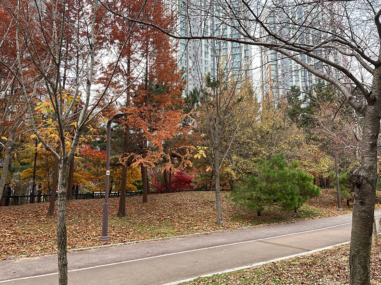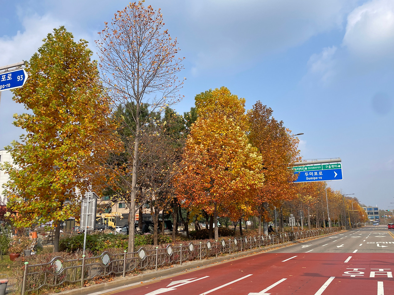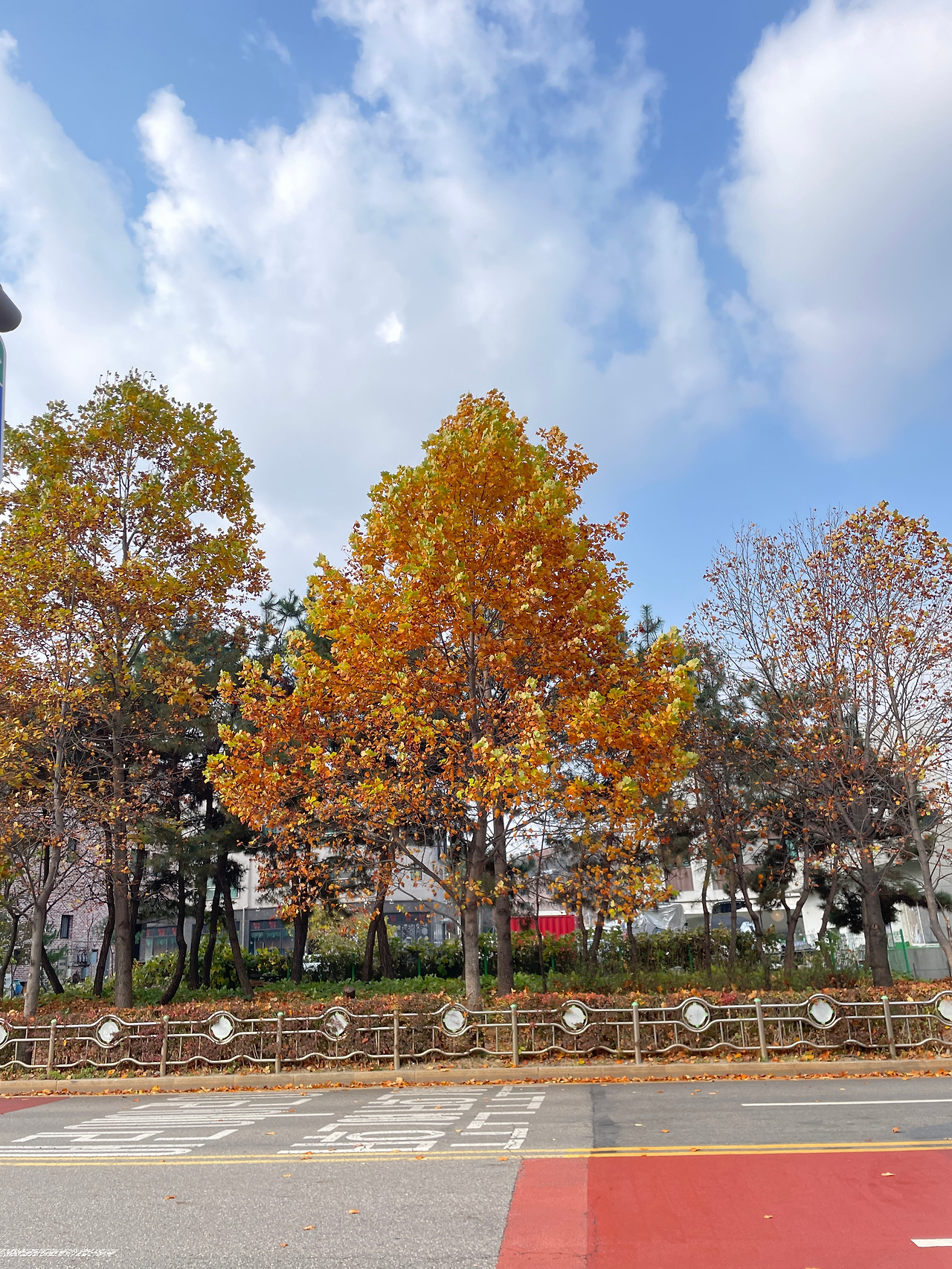 적당한 쌀쌀함에서 오는 상쾌함, 공간이 광활하게 비어있는 듯한 건조함과 명료함. 차갑지만 시원한 바람을 맘껏 맞으며 새들이 지저귀는 아방가르드?한 화성을 즐기고 있는데 기대도 하지 않았던 늦가을의 풍경이 이 날씨에 맞춰 너무나 아름답게 펼쳐져 있었다. 이 정도면 촉각, 청각, 시각의 삼단콤보 행운이 맞아떨어지는 귀한 날이다.