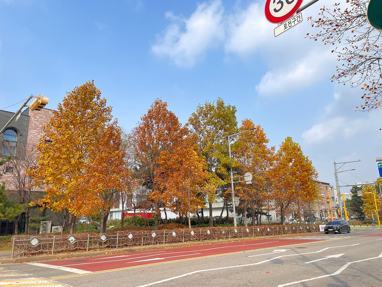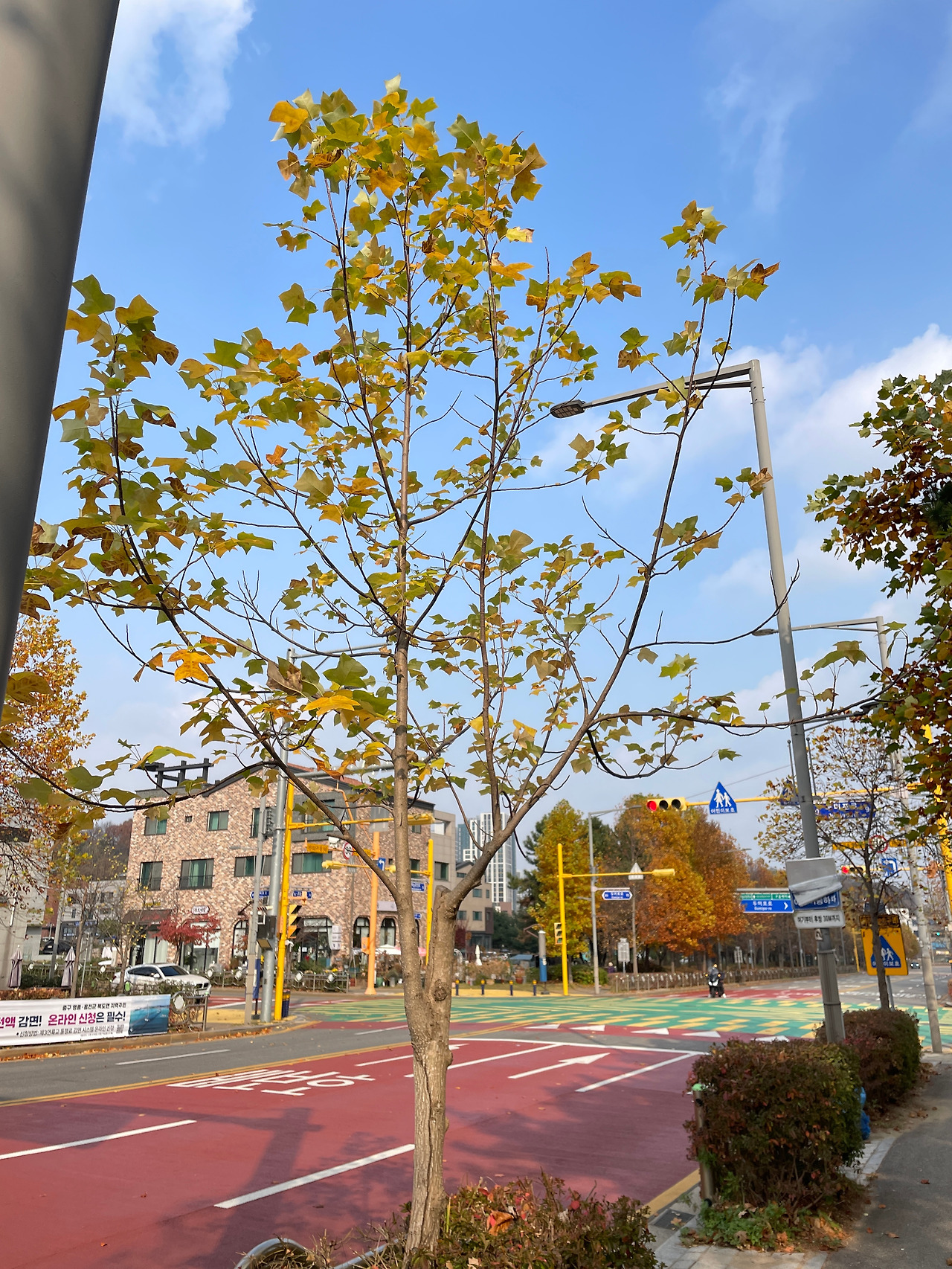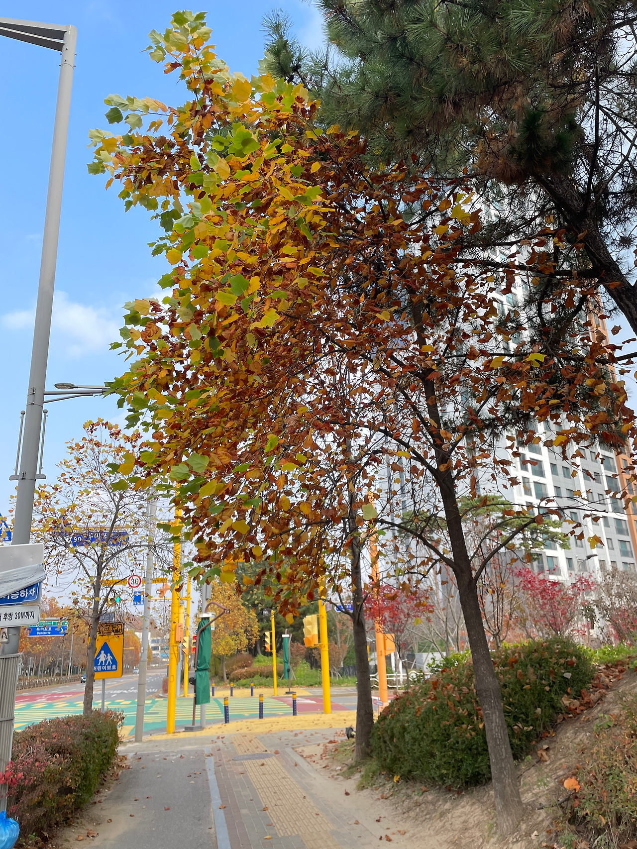적당한 쌀쌀함에서 오는 상쾌함, 공간이 광활하게 비어있는 듯한 건조함과 명료함. 차갑지만 시원한 바람을 맘껏 맞으며 새들이 지저귀는 아방가르드?한 화성을 즐기고 있는데 기대도 하지 않았던 늦가을의 풍경이 이 날씨에 맞춰 너무나 아름답게 펼쳐져 있었다. 이 정도면 촉각, 청각, 시각의 삼단콤보 행운이 맞아떨어지는 귀한 날이다.