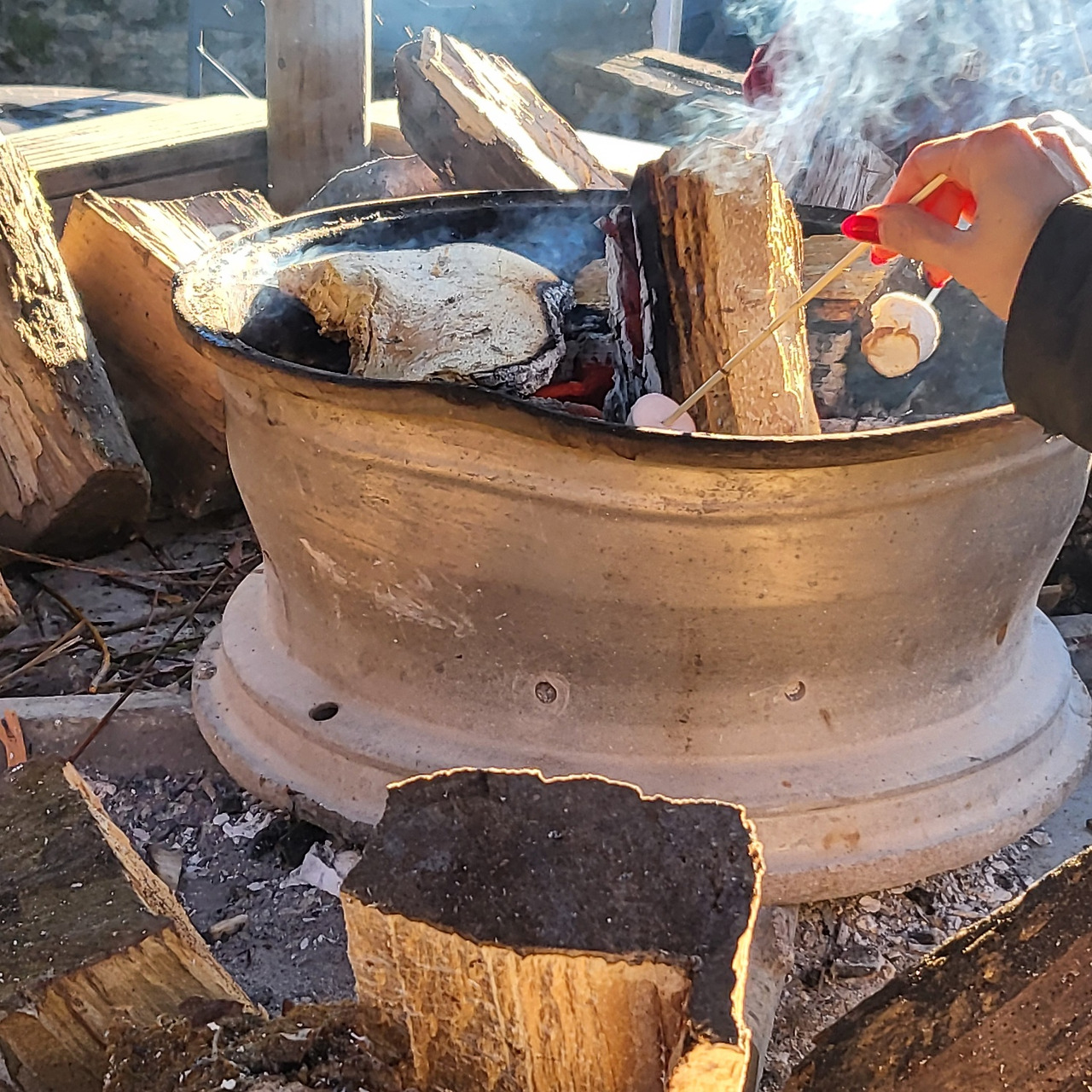 버튼온더워터에서 마을을 한 바퀴 돌고 작은 카페에 들어갔어요. 바깥에 테이블이 있었는데 추워서 그런지 장작불을 피워두었더군요. 나무 타는 연기와 향이 주변에 자욱한데, 긴 꼬챙이를 들고 아이들이 주변에 매달려서 마시멜로를 굽고 있었지요. 핫쵸코를 한 잔씩 마시며 딸과 함께 그 풍경을 구경했어요. 딸은 하루종일 문의한 내용과 내일 뷰잉 일정을 알려주었어요. 바깥은 평화로운데 마음은 해결해야 될 일로 가득 차서 풍경을 만끽할 공간은 부족했네요.