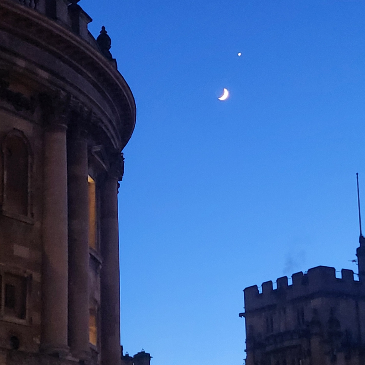영국의 1월은 해가 짧아 4시쯤부터 석양이 물들기 시작하더군요. 옥스퍼드에는 4시 반경에 도착하여 어디가 어딘지도 모를 밤거리를 가이드를 따라다녔어요. 이 투어는 여름에 가는 게 좋겠다는 생각을 했어요. 도서관 앞 카페에서 초승달을 올려다 보며 파니니를 하나씩 먹고 아침에 출발한 곳으로 돌아왔어요. 긴 하루였어요.