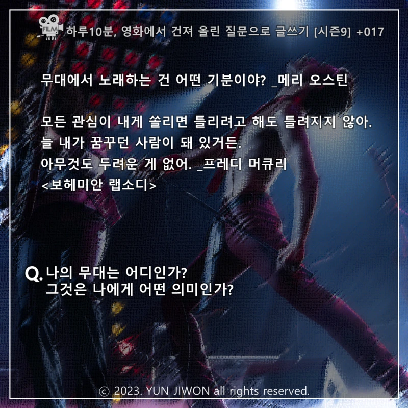 쓰다 보니 깨닫는다. 일상이 나의 무대구나. 때로는 루즈하게 때로는 열기로 들떠 내리막과 오르막을 넘나드는 스펙터클한 무대다. 각자가 주연이며 서로의 조연이 기꺼이 되어주는 우리들의 무대가 참 소중하다.