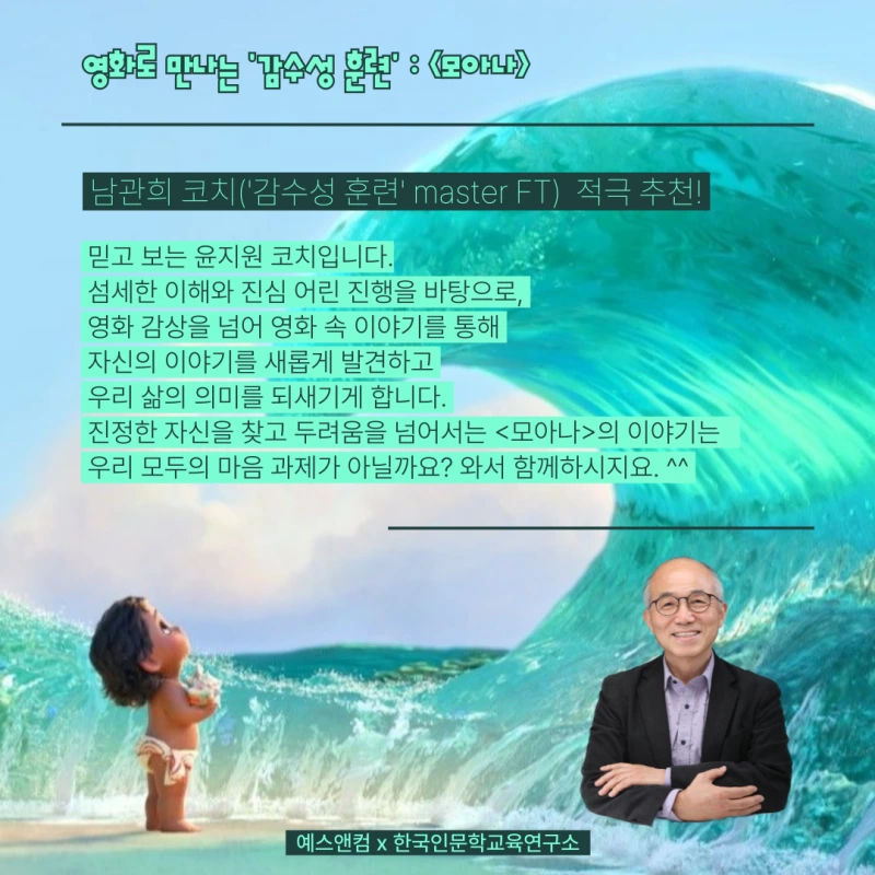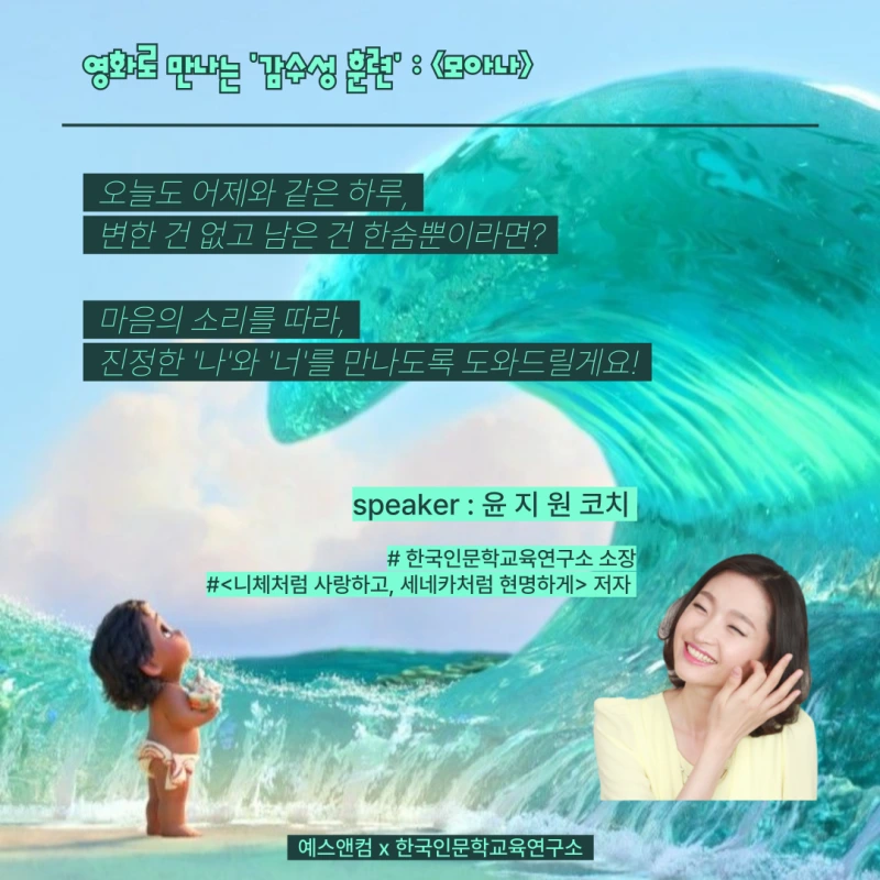 이 글이 마음을 울렸다면 이번 주 토요일(11월 16일) 오전 10시에 '애니메이션 <모아나>로 만나는 감수성 훈련'에서 우리 만나요. 2시간 동안 우리의 마음을 나누고 몰랐던 마음을 찾고 자신 안에 있었던 단단하고도 강인한, 고귀함을 발견하는 시간이 될 거예요.
