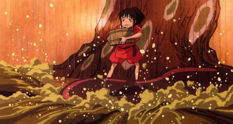 이 작품에 두 용이 나온다. 하나는 오물 신인 줄 알았던 강 신. 또 하나는 하쿠로 알고 있던 ‘니기하야미 고하쿠누시’이다. 강 신이 오물을 뒤집어쓰고 똥 내를 풀풀 풍기며 무거워 보이는 몸을 땅에 끌며 온천장에 들어오는 장면이 정말 압권이다. 갓 지어온 밥도 악취로 인해 폭삭 사그라들 정도, 치히로가 이 온천장에서 일하며 존재감을 처음 드러내는 때이기도 하다. 온천수에 몸을 담근 강 신에게서 오물이 모두 쏟아지고 나자 하얀 용의 몸에 하회탈 같은 얼굴로 산타 할아버지처럼 ‘허 허 허’ 웃으며 가벼운 몸이 되어 날아간다. 강 신의 몸에서 쏟아져 나온 오물은 모두 인간이 만들고 버린 생활용품들이다. 자전거, 고물, 고철 등. 비본질이 제거되니 본질만 남은 존재는 가볍고 자유하다.