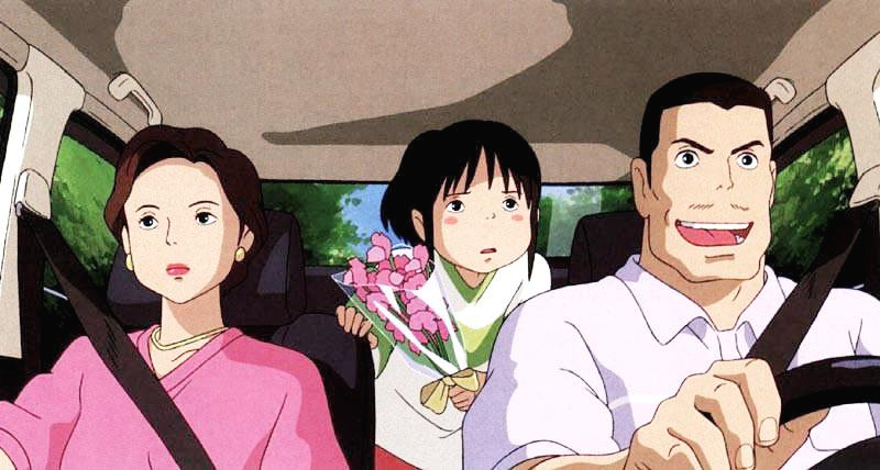 치히로는 친한 친구들과 헤어져 다른 곳으로 이사하는 이 상황이 마음에 들지 않는다. 태어나 처음 받은 꽃다발이 전학 때문이라니... 차 뒷자리에 누워서 부은 눈으로 친구들에게 받은 편지와 꽃다발을 번갈아 보아도 속상한 마음은 풀리지 않는다. 이사한 곳에 거의 다 와가는 듯한데 길을 잘못 들어 치히로 가족이 탄 차가 산 길로 접어든다. 거친 길을 달려 멈춘 곳은 이상한 표정으로 웃는 석상 앞이다. 석상 뒤로 어두운 터널 입구가 있다. 바람 소리와 함께 낙엽이 입구 쪽으로 조금씩 이동한다. 마치 터널이 바람을 빨아들이는 듯이. 무엇에 홀린 듯이 엄마와 아빠는 이상한 소리가 나는 터널 안으로 들어가고 치히로는 혼자 있기가 무서워 부모님을 따라 들어간다.