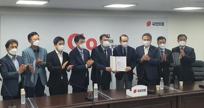 윤석열 전 검찰총장이 2일 서울 여의도 국민의힘 당사에서 입당원서를 든 채 환영식을 하고 있다. ⓒ필자 촬영