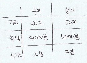 이런 문제들을 학생들이 처음 접하면 무엇을 먼저 해야 할지 몰라 우왕좌왕한다. x 라는 미지수를 써야할 것 같아 미지수를 썼다 지우기만을 반복할 뿐 식을 세우기 어려워 한다. 그런 학생들에게 문제의 뜻을 파악하기 위해서 거리, 속력, 시간을 세로축으로 하고 가로축에는 수지, 승기라고 표를 그리게 한다. 우선 표에 확실한 조건을 먼저 채운다. 수지의 분속 40m, 승기의 분속 50m가 들어가야 할 곳은 확실하다. 가로축 수지의 세로축 속력 부분, 가로축 승기의 세로축 속력부분에 각각 채운다. 여기까지는 그리 어렵지 않다. 다음은 미지수 x 를 무엇으로 할지 정해야 한다. 두 사람은 각자의 집에서 동시에 출발한다고 했으니 두 사람이 걸은 시간은 서로 같다. 그리고 문제에서 두 사람은 출발한지 몇 분 후에 서로 만나는지를 물어봤으므로 미지수 x 는 두 사람이 각자 걸은 시간. 가로축 수지, 승기의 세로축 시간 부분에 모두 x를 채워 놓는다. 이제 거리만 남았다!