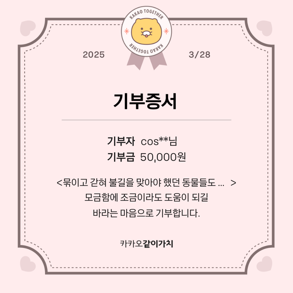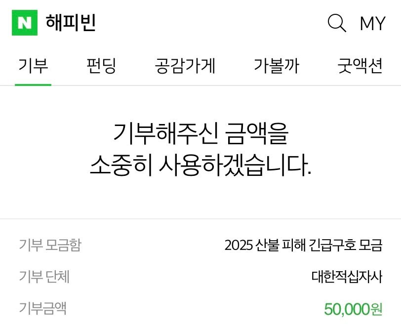 + 최근 경북 지역에서 발생한 대규모 산불로 인해 인명 피해가 속출하고 있다는 소식을 접했습니다. 뉴스를 보고 마음이 무거워 소액이지만 기부를 했어요. 피해가 더 이상 커지지 않고, 빠르게 진압되길 바랍니다.