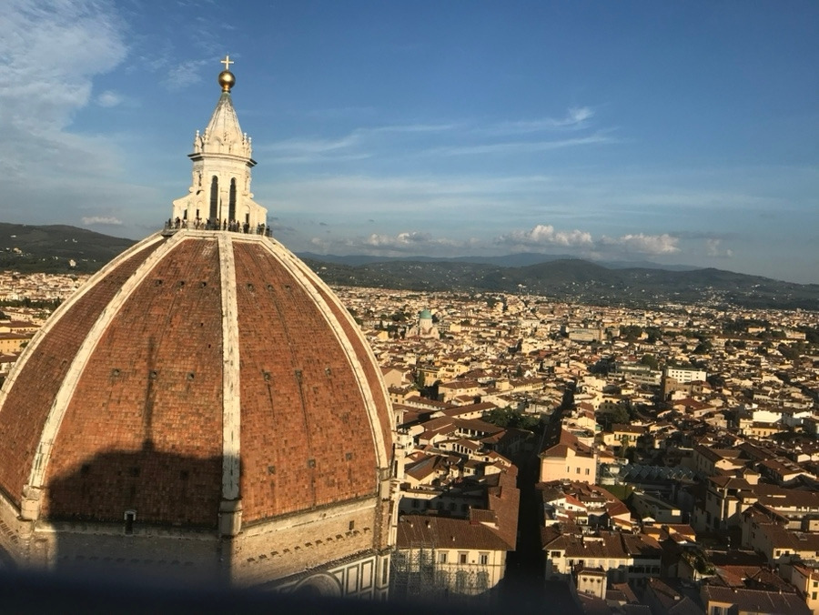 악전고투 끝에 도착한 종탑 정상. 눈앞에는 피렌체의 붉은 지붕들이 끝없이 펼쳐져 있었고, 두오모의 거대한 돔은 손에 닿을 듯 가까웠다. 멀리 아르노 강도 흐르고 있었다.