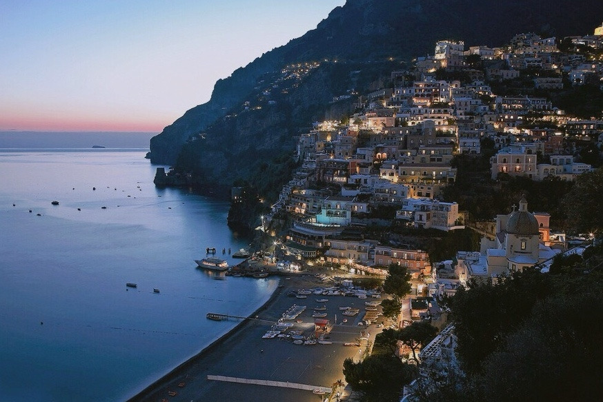 아직 완전히 어두워지지 않은 하늘, 연한 분홍빛과 푸른빛이 섞인 저녁노을. 색과 색이 스미는 경계는 너무도 자연스러워, 어디서부터 밤이 시작되는지조차 알 수 없었다. 절벽을 따라 촘촘하게 들어선 집들은 하나둘 불을 밝히기 시작했고, 그 불빛은 마치 물결처럼 산비탈을 따라 흘렀다. 조용히, 그러나 분명하게 밤이 도시를 채워가고 있었다. 그 빛들은 마치 포지타노의 밤을 위한 무대를 완성하는 듯했다.