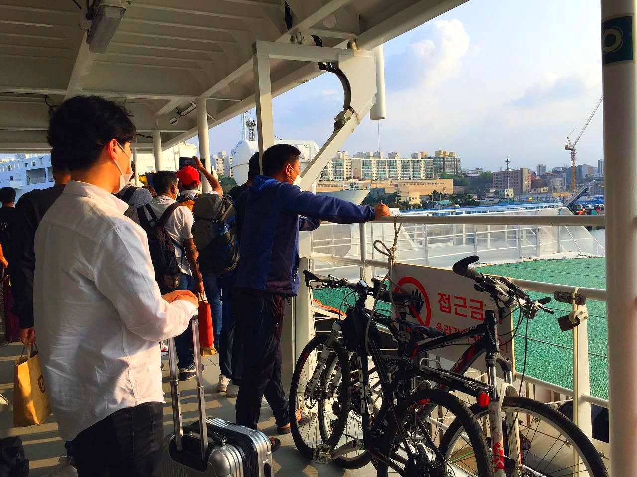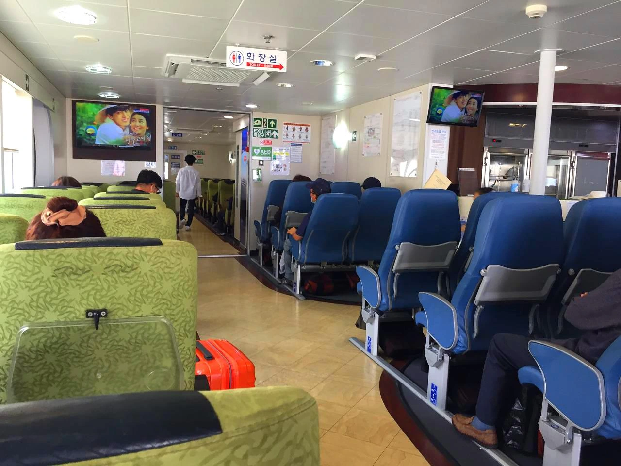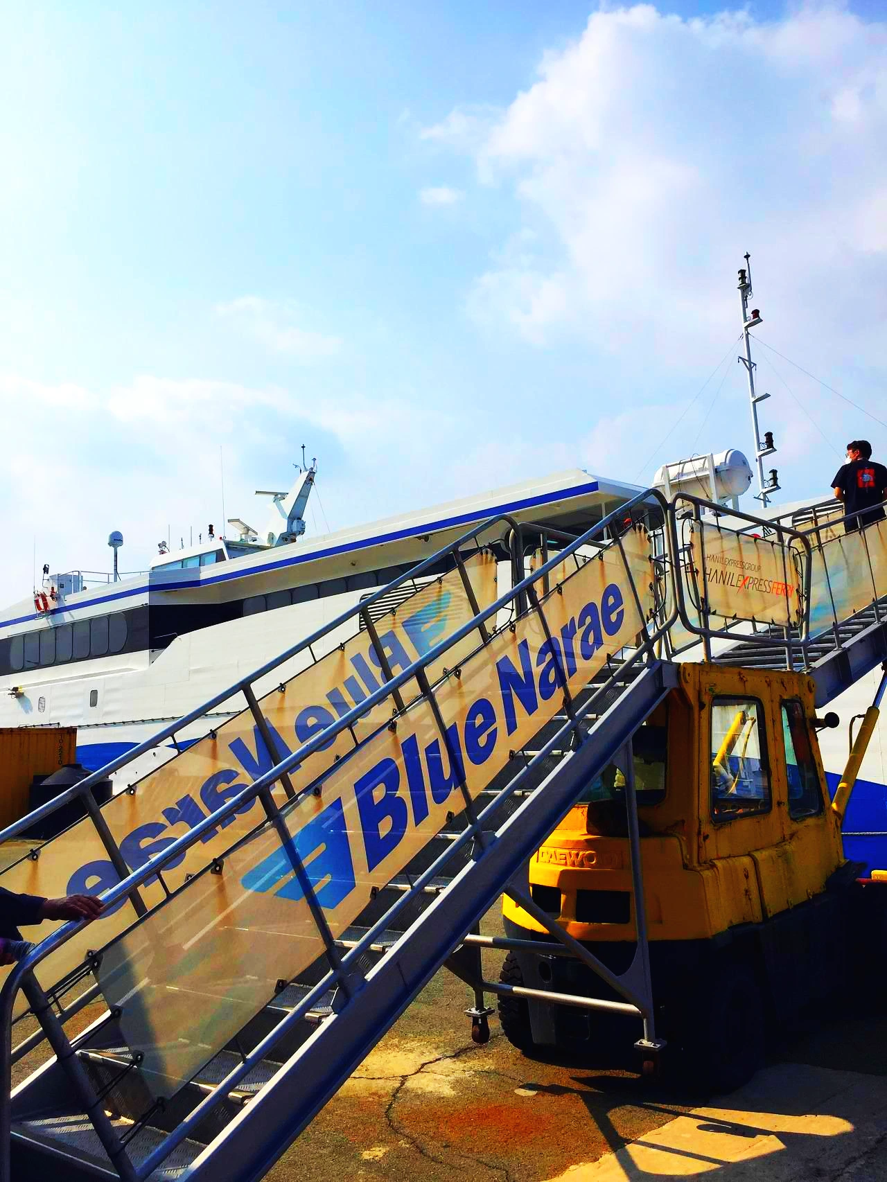 블루나래호는 1등석과 2등석으로 나뉘는데 가격차이는 6000원가량이다. 1등석은 배의 앞쪽으로 전망이 더 좋고 의자가 널찍하고 편해 보였지만 큰 차이도 없어 보여 6000원을 아껴 카페를 하루 더 가자 싶어 2등석으로 예매했다. 가격은 편도로 4만 원 정도. 배에 오르기 전에는 표검사와 함께 신분증 검사 그리고 체온검사를 마쳐야 한다. 배에 들어가기 전에는 입구에서 직원이 자리 번호를 확인하고 자리로 안내를 해주는데 혹시 2등석 손님이 1등석으로 가 앉을까 사뭇 철저하게 관리를 하고 있었다.