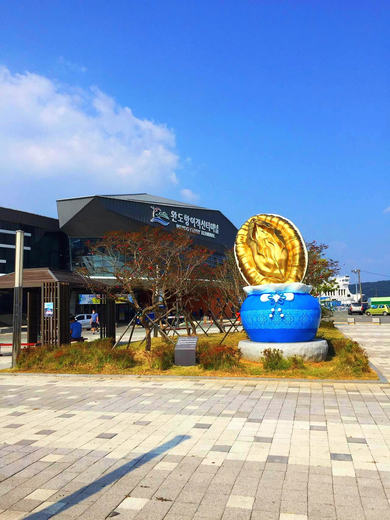 완도항에 들르기 전에 시간이 좀 남아서 완도항 맞은 편의 카페로 들어가 아메리카노를 시켜 놓고 핸드폰을 급 충전했다. 이 당시 내가 갖고 다니던 핸드폰은 아이폰 6으로 이미 3년째 들고 다녔기에 조금만 지나도 배터리가 간당간당해지던 때여서 왜 진작 새 아이폰을 사지 않았나 후회를 했다. 원래의 목표는 제주도를 가기 전에 배터리가 빵빵한 새 휴대폰을 장만해서 가는 것이었는데, 여하튼 제주여행 이후 배터리의 심각성을 느끼고 바로 새 아이폰을 주문해서 샀다. 어차피 살 것을 조금만 더 일찍 샀으면 좋았을걸. 나중에 제주도에서 올레길을 걸을 때도 대충 하루 7시간 중 꼭 중간 즈음에서 핸드폰 배터리가 나가려고 해 카페에 들러 충전을 해야 했던 기억이 난다. 왜 진작 사지 않았을까! 올레길을 걷는 도중 핸드폰 배터리가 나간다는 생각만 해도 끔찍할 지경. 간혹 길을 잃거나 혹은 다치거나 해서 도움이 필요한 일이 생길 수도 있기 때문이다. 핸드폰 충전이 30퍼센트 정도 되었을 때 나는 급히 핸드폰과 짐을 챙겨 완도항으로 갔다. 출항시간 30분 전에 체크인을 맞춰야 했는데 괜히 마음이 조급하여 40분 전에 갔더니 아직 게이트가 열리지 않았다. 그래서 다시 여객터미널 밖으로 나와 완도의 전복 조각상을 구경하며 주변을 걸어 다니다 너도 나도 물고 있는 아이스크림도 하나 따라서 사 먹었다.