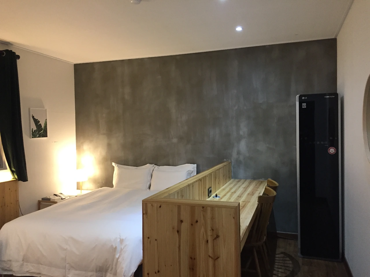 낯선 도시에서 모텔에 자는 것은 역시 부담이 되어 5-6만 원대의 리뷰가 아주 좋은 호텔을 잡았는데 리뷰대로 여사장님이 아주 친절하시게 프리미엄 룸으로 업그레이드에 아침 뷔페까지 공짜로 넣어 주셨다. 방에 들어가니 말로만 듣던 스타일러가 있어 사실 스타일러가 필요 없는 청바지와 티셔츠를 넣어 두었는데 글쎄...... 스타일러의 좋은 점은 크게 느껴보지 못했던 것 같아 아쉬웠다.