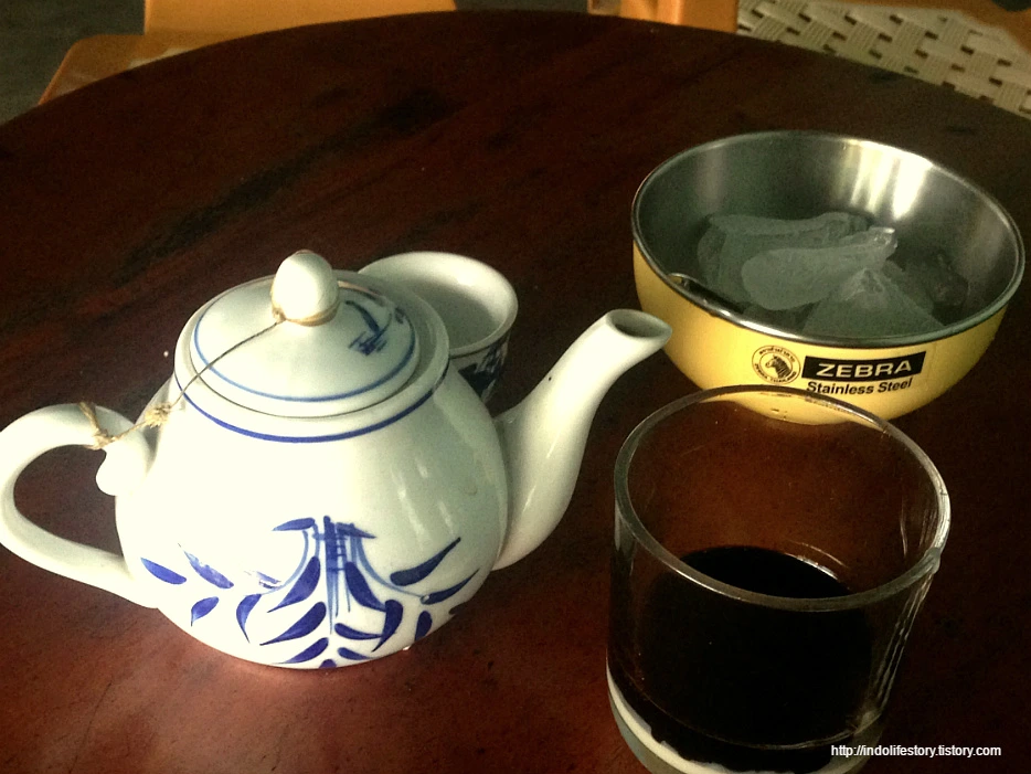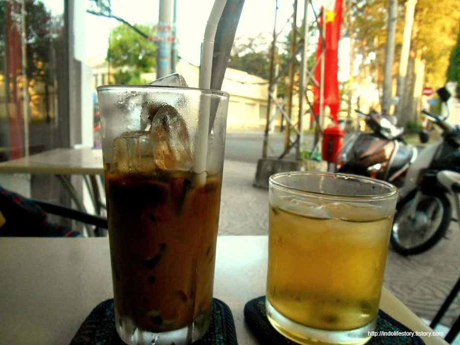 특이한 점은 베트남 커피는 양이 적고 무척 쓴 탓에 위의 사진과 같이 녹차가 늘 함께 나온다. 추운 날에는 따뜻한 차가, 무더운 날에는 차가운 녹차를 함께 대접한다.