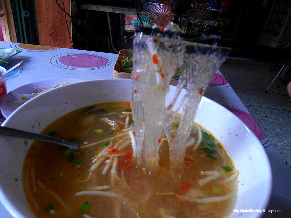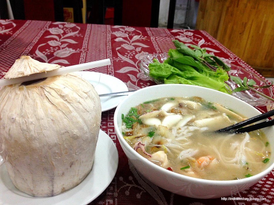 코코넛 주스와 함께 여행자 거리에서 먹어 본 Pho Haisan (해물 쌀국수). 여행자 식당에서 2500원 정도.