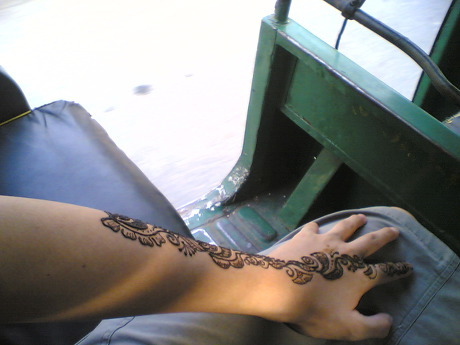 집으로 돌아가는 오토릭샤 안에서 오르까가 그려준 헤나가 번지지 않게