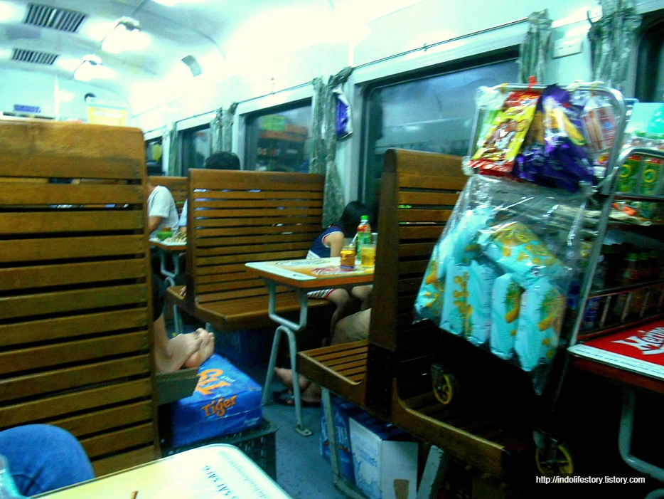 각 기차의 맨 앞칸은 식당 칸이다. 쌀국수나 밥을 주문할 수 있고 맥주도 마실 수 있다. 열악한 시설 때문에 사람이 바글바글하지는 않다. 사실 그다지 앉아 있어야 할 필요성을 못 느끼겠다. 다만 쌀국수 등은 기차 칸 좌석이나 침대에서 먹을 수가 없으니까 식당칸으로 와서 주문을 하면 된다.
