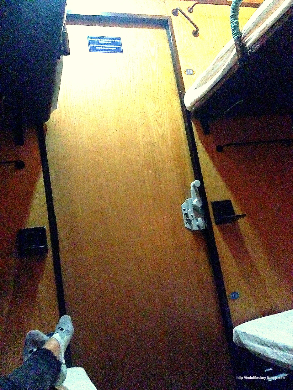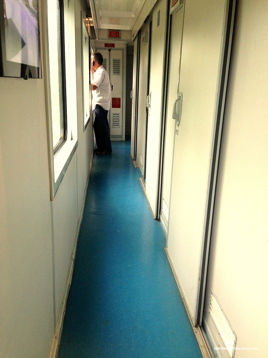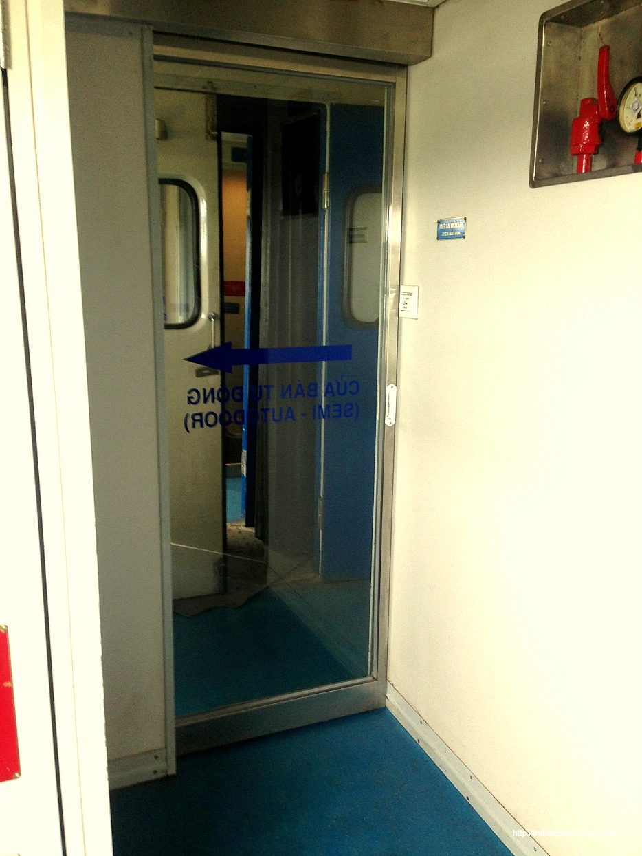칸마다 있는 문. 오른쪽에 있는 하얀 버튼을 열면 열린다. 칸마다 앞 뒤 쪽에 화장실이 있고 칸 사이에서는 흡연이 가능하다. 세면실도 칸마다 있어서 간단히 씻거나 양치 등이 가능하다. 침대에 누워 있다가 지루하면 복도에 서서 창밖을 바라보기도 한다.