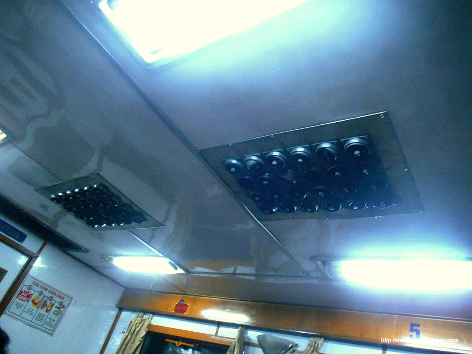 식당 칸 천장의 수많은 에어컨들. 왜 저리 많이 달았는지 징글징글.