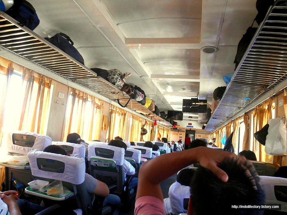 3시간 정도 걸리는 시간이면 거의 이 푹신한 의자를 타곤 했다. 중간 좌석은 탁자를 마주하고 4 좌석이 마주 보고 있고 그 좌석을 중심으로 정방향 역방향으로 되어 있는 구성에 에어컨이 있다. 30도를 넘는 날씨면 에어컨이 있어도 그리 시원하지 않지만 밤이 되면 춥게 느껴지기도 한다. 사람이 거의 꽉 차지만 맨 뒷좌석은 비어 있는 경우가 많아서 답답하면 뒤로 가서 혼자 앉아 있기도 했다. 창문을 열을 수 없으니 날씨가 좋은 날에는 이 칸 보다 창문을 열 수 있는 딱딱한 의자 칸이 더욱 시원하게 느껴지기도 한다.