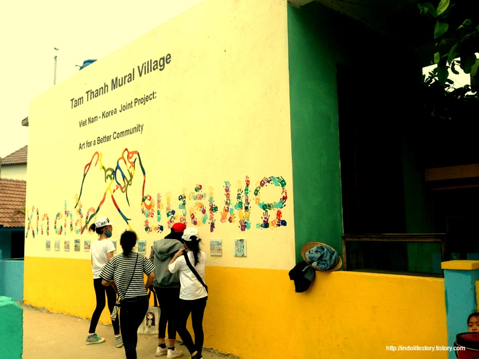 이 마을의 이름은 Tam Thanh mural village로 입구에서 조금 걸어 들어가면 베트남어와 한국어로 나란히 쓰여 있는 신짜오 그리고 안녕하세요의 벽화를 만날 수 있다. 이 벽화가 가장 인기 있는 곳으로 많은 사람들이 기다리며 이곳에서 사진을 찍고 있었다.