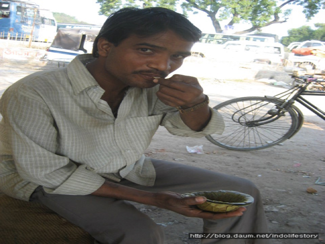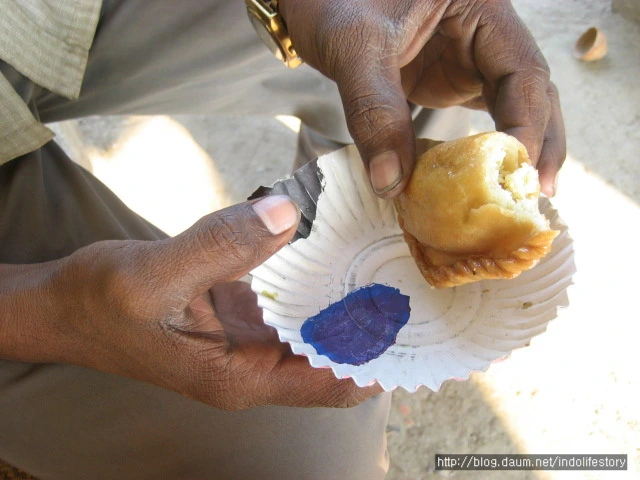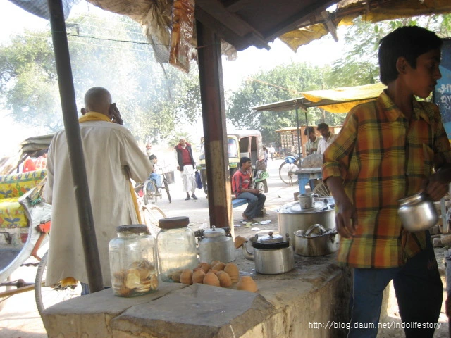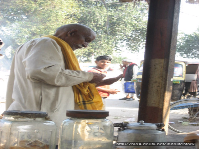 때마침 내 옆에 앉아 있던 손님은 인도의 삼륜차인(택시 대용이라고나 할까) 오토릭샤를 모는 오토릭샤 왈라였다. 그는 짜이 한잔을 시키고 짜이가 나오기 전에 우선 알루(감자)를 넣고 튀긴 간식으로 잠시 고픈 배를 채우는 중이었다.
