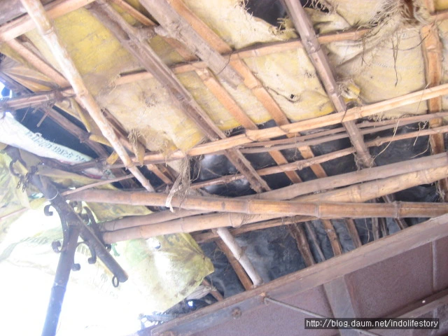 떨어질락 말락 대나무로 대충 이어 만든 지붕 아래