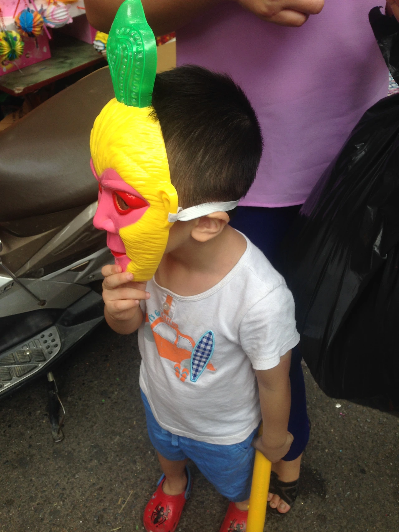 추석에 나타날지도 모를 잉어 귀신을 물리칠 무시무시한 가면과 칼을 들고 싸움을 연습하기도 하고