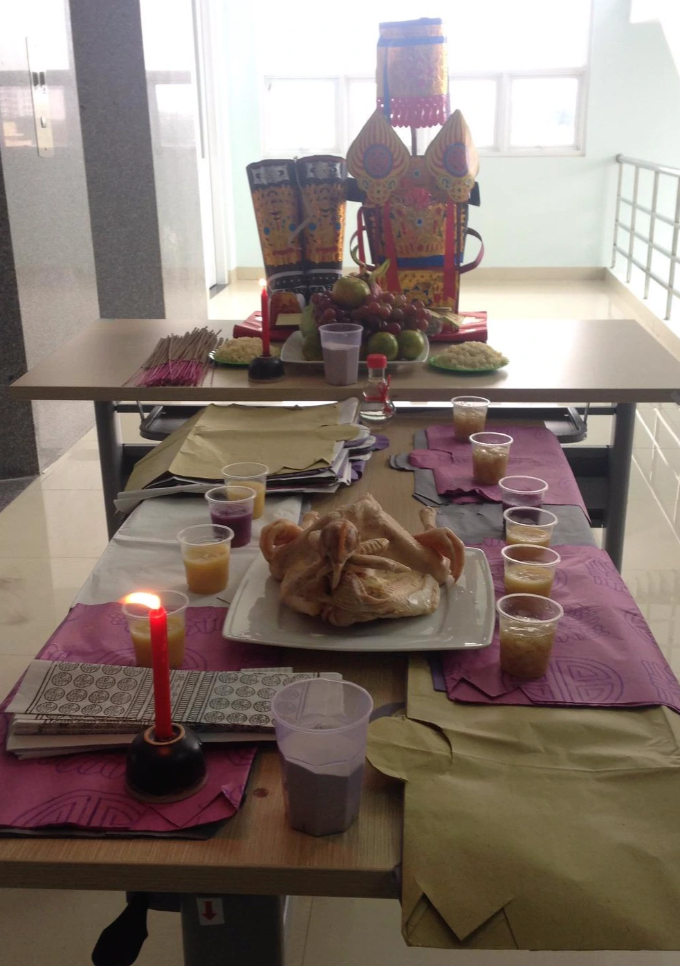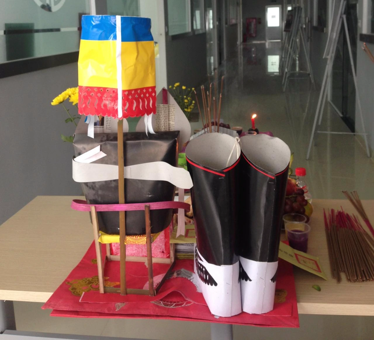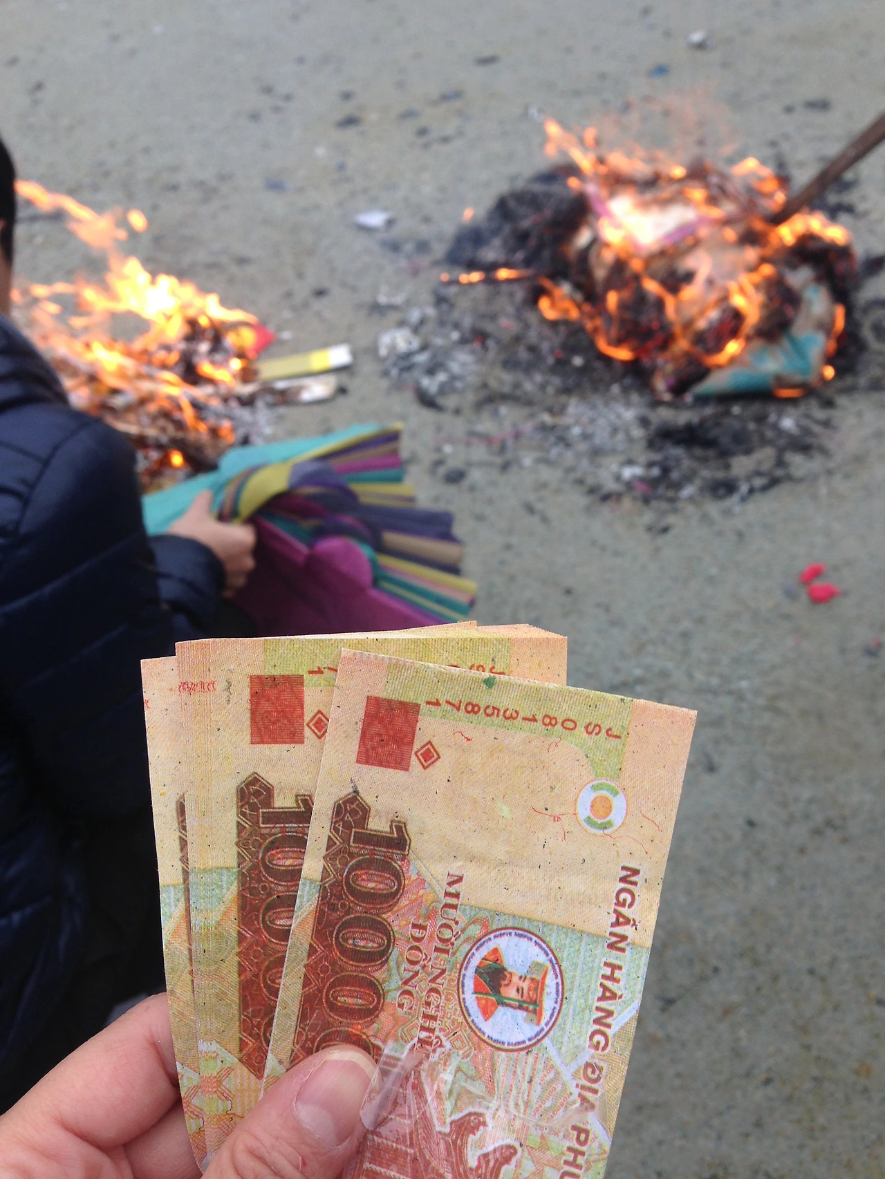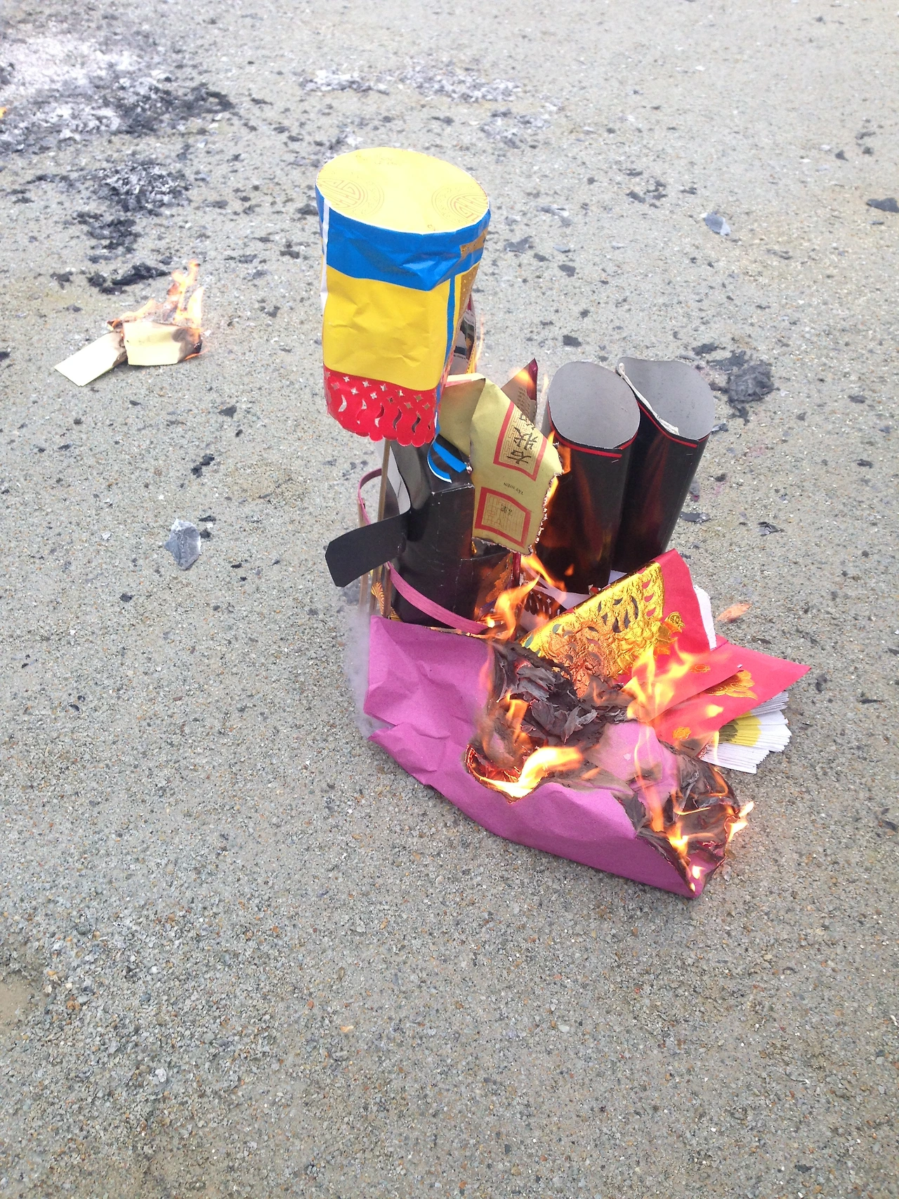 간혹 가짜 돈도 함께 태워 조상신에게 용돈도 드린다고 한다. 중요한 점은 이 종이모형의 옷과 돈 등을 끝까지 재가되도록 태워야 한다는 것이다. 만약 완전한 재를 만들지 않고 대충 태우다가 말게 되면 조상신이 누더기가 된 옷을 입게 돼도 불에 그을린 표시가 나는 돈을 갖게 되기 때문에 끝까지 고운 재가 될 수 있도록 막대기로 부셔가며 태워야 한다. 제사 후 식사가 다 끝이 나면 이제 어린이들의 놀이를 위해 등불 등의 장난감을 들고 거리를 나가 축제를 즐긴다.