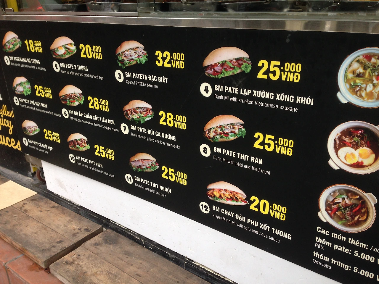 아침 식사로 파는 길거리의 반미를 즐길 수도 있고 혹은 두부나 고기를 구워 파는 길거리 상인에 조금은 거나한 아침식사를 주문해 먹을 수도 있다. 물론 길거리 식당은 대부분 좁은 공간을 이용하고 있기 때문에 스쳐 지나가는 오토바이들과 게다가 현지인들과 함께 옹기종기 낮고 작은 목욕탕 의자에 앉아 후다닥 먹고 일어나야 하는 불편함을 감수해야 하지만.