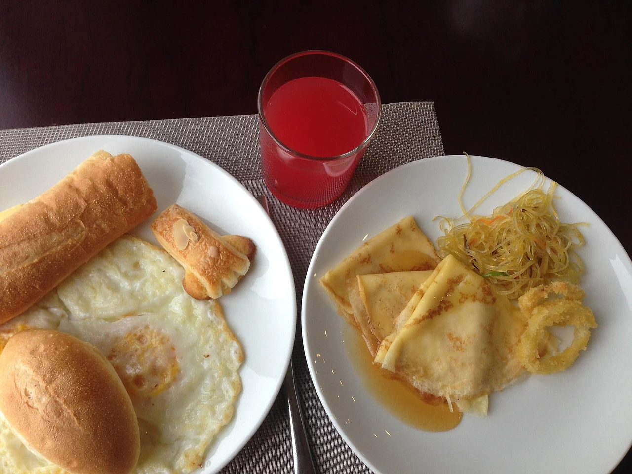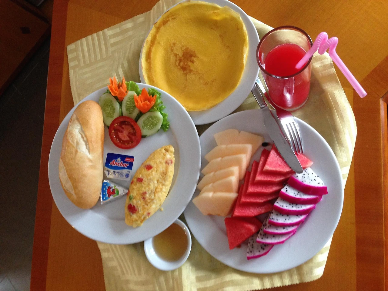 베트남 호텔에서 아침식사 메뉴로 고를 수 있는 것은 주로 쌀국수, 달걀과 바게트, 햄과 소시지, 허니 팬케이크, 볶음면 등이다. 역시 베트남의 바게트는 푹신푹신하고 질기지 않아서 계란과 먹든 그냥 잼과 버터만 발라먹든 그 맛은 언제나 환상이다. 원래 빵은 밥으로 치지도 않았었지만 베트남의 바게트는 나로 하여금 밥 보다 빵을 더 좋아하데 만들어 줬을 만큼 기막히게 맛이 좋다.