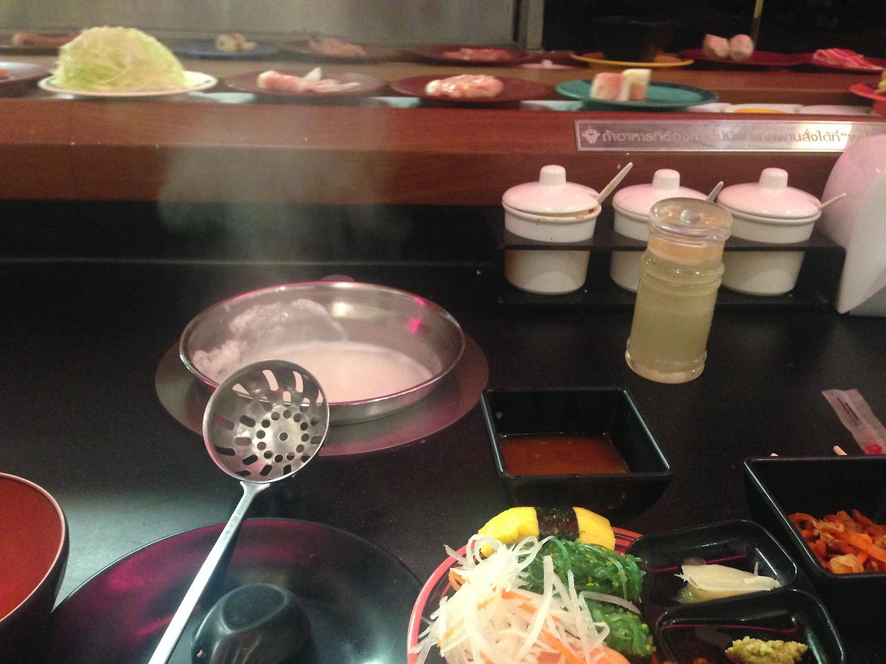 싼 값에 뷔페 문화가 잘 발달되어 있는 태국을 방문할 때마다 늘 고민되는 것이 뷔페에서의 혼밥인데 특히 샤브 시 같은 회전 샤브 집은 정면에 앉은 사람들을 바라보고 먹어야 하기 때문에 갈까 말까 어느 정도 고민이 필요한 곳이다. 1일 샤브가 가능한 데다 초밥이나 튀김 등도 먹을 수 있는 곳이라서 태국을 갈 때마다 늘 방문하는 곳인데도 이상하게 어색함은 감추기가 힘들었다. 다행히 직원들이 알아서 혼 샤부샤부를 하고 있는 손님 근처로 안내를 해주는데 혼 샤부샤부를 하면서도 혹시 내 옆자리의 손님이 다 먹고 먼저 가버리면 어쩌나 눈치를 안 볼 수가 없는 곳이다.