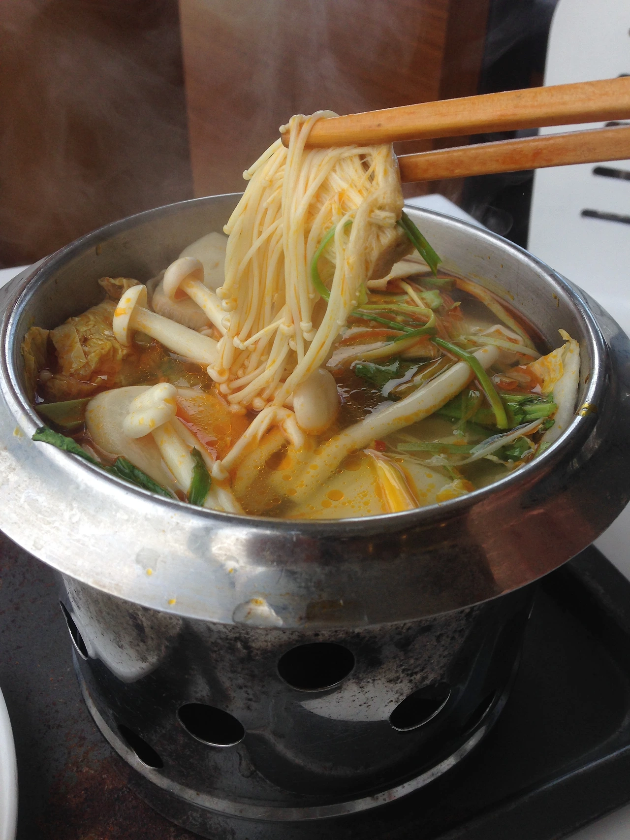 갖은 버섯과 파를 포함한 야채가 풍성하게 들어가 있고 고추와 레몬, 버섯을 찍어 먹을 수 있는 베트남의 특제소스인 느억맘(피쉬 소스) 그리고 출출함을 달래줄 쌀국수가 딸려 나온다. 기본 양념은 칠리 소스가 들어가 있어서 조금 매울 수 있으니 나처럼 매운 음식이 싫다면 안맵게 해달라고 하면 된다. 그래도 혹시 맛이 안날까 칠리 소스를 조금 뿌린 듯 한데 다행히 그리 맵지는 않았다. 냄비가 끓어 오르기 전에 쌀국수를 조금 떼어 내 공기에 덜어 놓고 냄비가 보글보글 끓어 오르기 전까지 한강을 바라 보며 기다리자.