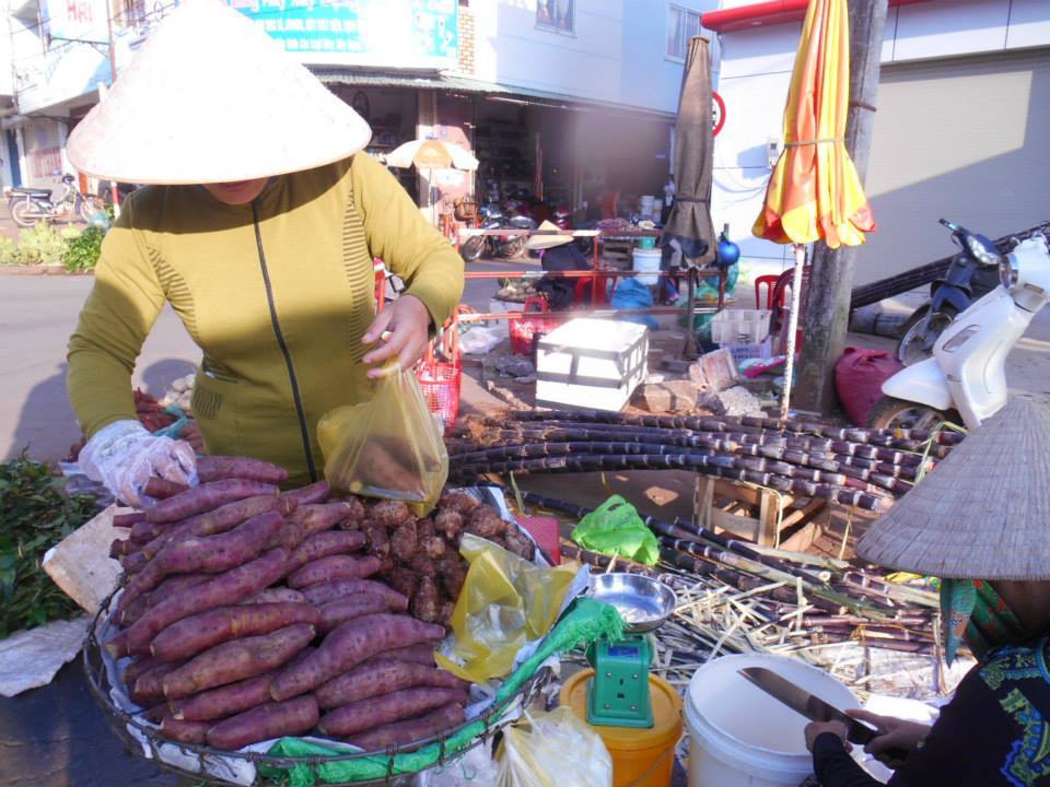 커피를 마시고 과일을 사서 다시 호텔을 들어가기로 했다. 우리나라와 비슷한 느낌의 과일들을 발견하고는 우리는 자두랑 귤 그리고 감도 샀다. 베트남의 고산지대에서만 구경할 수 있는 우리나라 느낌의 과일들이 너무나도 반가웠다. 특히 자두, 너. 아침식사로는 과일가게 건너편에 파는 고구마로 결정하고 사탕수수를 마시며 고구마를 싸서 호텔로 들어가서 고구마도 냠냠 먹으며 한가로이 이 낯선 도시의 서늘한 오전을 즐겼다.