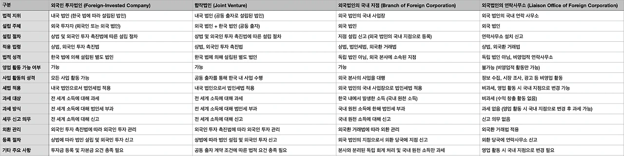 • 외국 투자자가 한국에 설립하는 법인으로, 내국 법인과 동일하게 전 세계 소득에 대해 과세됩니다.