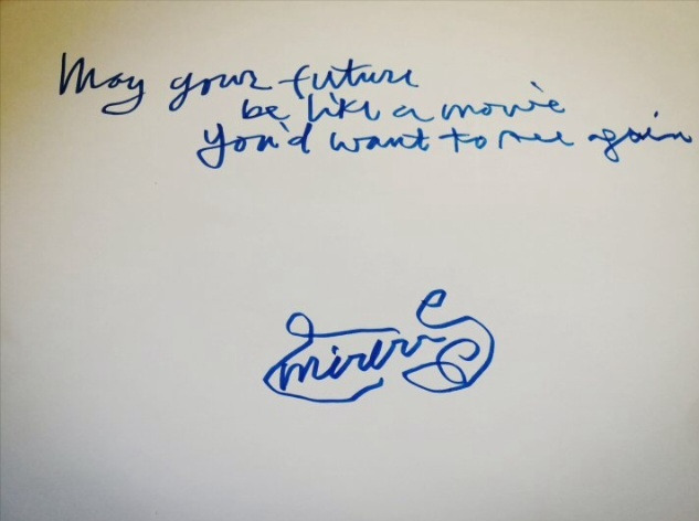 이름을 물어보고, 날짜를 쓰고, 평범하게 사인을 해주실 줄 알았는데, 영어로 꽤 길게 무언가를 적으셨다. 앞 뒤로 늘어선 사람들이 많았음에도 한 명 한 명 정성껏 글자를 쓰셨다. 푸른색 유성펜으로 쓴 꼬불 꼬불한 글자들은 마치 헤엄치는 고래 같았다.
