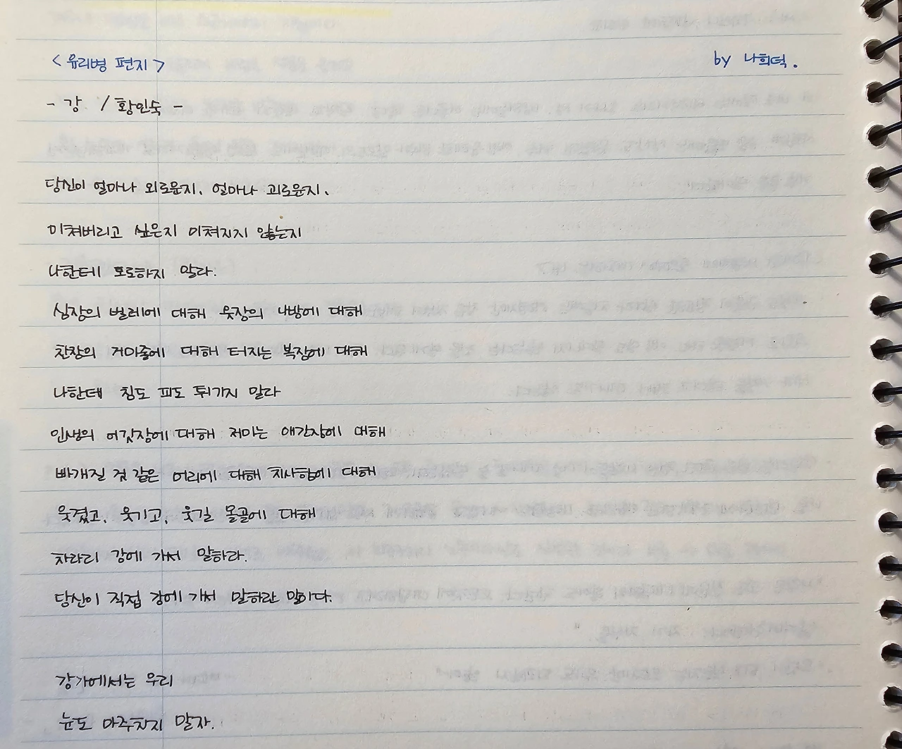 그런 맥락에서 황인숙 작가의 '강'은 무릎을 탁 치게 만든 시였다. 화자는 당신의 외로움과 괴로움, 미칠 것 같은 마음 모두 나에게 얘기하지 말고 강에게 가서 말하라고 한다. 강가에서는 서로 눈도 마주치지 말자고. 지은이는 언제 이 심오한 진리를 깨달은 것일까? 이 글을 좀 더 일찍 읽었더라면 긴가민가했던 내 마음에 쐐기를 박아주었을 텐데.