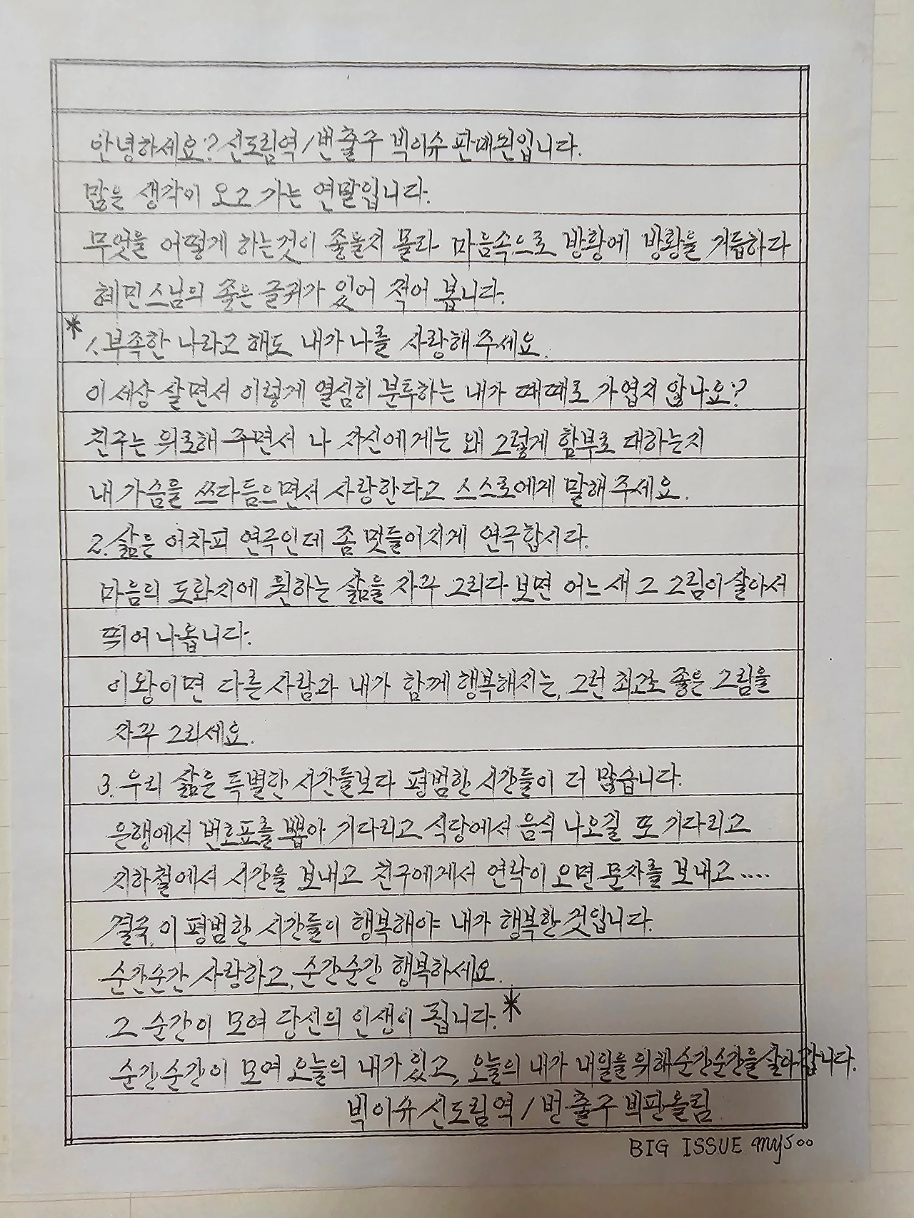 저는 빅이슈 판매원으로 부진을 만회하고자 새로운 일자리에 도전을 했고, 빅이슈 판매와 병행하며 조금은 고단한 여정을 걷고자 합니다. 아마도 이 편지를 쓰는 일주일 후부터는 새로운 일터에서 일을 하다가 그 일이 끝난 후 판매를 하기에 지금보다 늦은 시간에 판매를 시작하게 되었습니다. 이른 시간에 빅이슈를 구입하시는 독자님에게는 죄송한 일이지만 열심히 살려고 애쓴다고 생각하고 좋게 보아주시면 그것 또한 저에게 보내는 응원이라고 생각하고 큰 힘을 얻을 수 있을 것입니다.