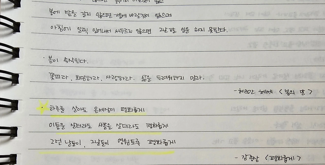 무엇보다 응원의 마음을 담은 짧은 시를 적어주고 싶었다. 필사노트에 담긴 수많은 글들을 꼼꼼히 읽으며 최종적으로 골랐던 시가 바로 김종삼 시인의 '평화롭게'였다.