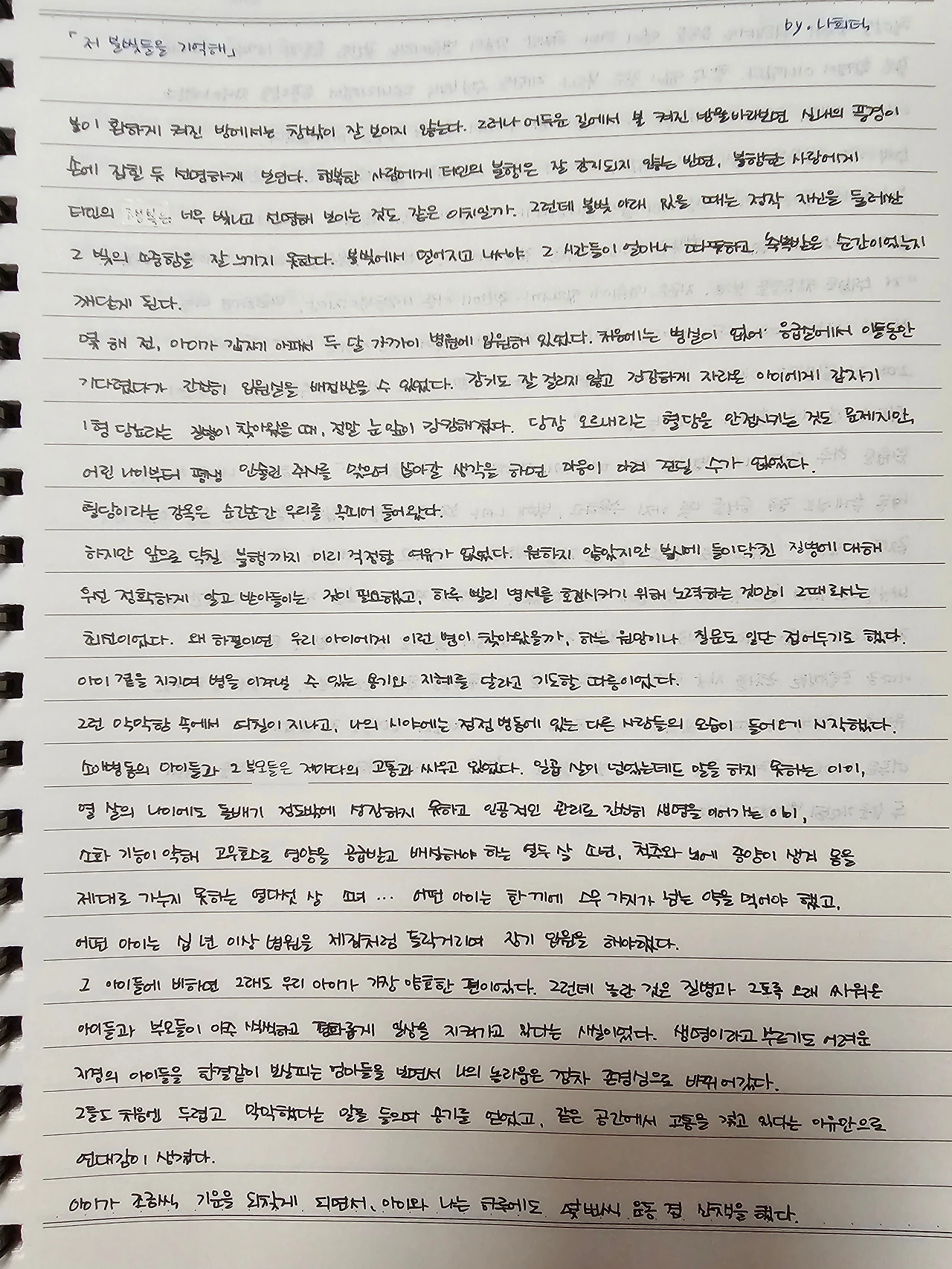 이따금 종합병원 근처를 지날 때면 나도 모르게 불 켜진 창문들을 한참 올려다본다. 저 불빛 중 하나로 위태롭게 깜박이던 때가 있었지. 그때 함께 있었던 아이들과 엄마들도 잘 있겠지.
