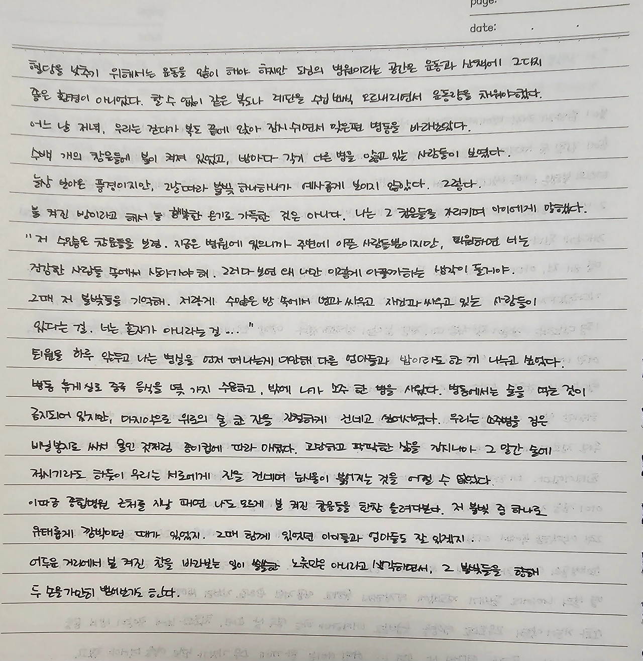 제목은 <저 불빛들을 기억해>였고, 읽고 좋아서 필사 노트에 적은 부분도 제목과 동일했다. 가끔 문장이나 구절이 아닌 전체 글을 모두 옮겨 적는 경우가 있는데, 유려한 문체와 필력에 일부분만 가려내기 어려울 때 그렇다. 팔운동은 조금 고되지만 꿋꿋이 다 옮기고 나면 몇 번을 다시 읽어봐도 좋은 수필들을 모아볼 수 있어 내게 분명 도움이 되리라 생각한다.